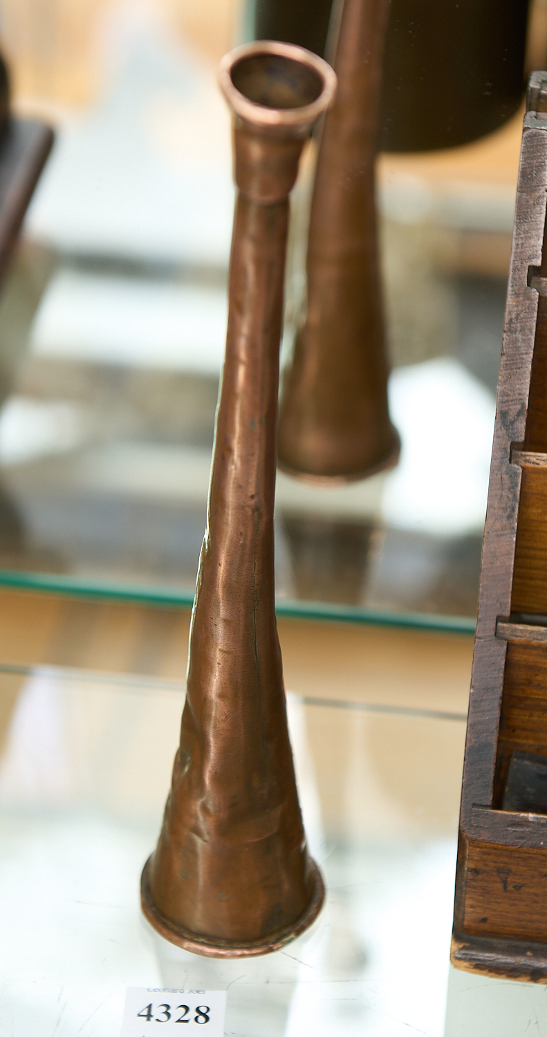 AN ENGLISH COPPER HUNTING HORN (A/F) H.25CM, LEONARD JOEL LOCAL DELIVERY SIZE: SMALL