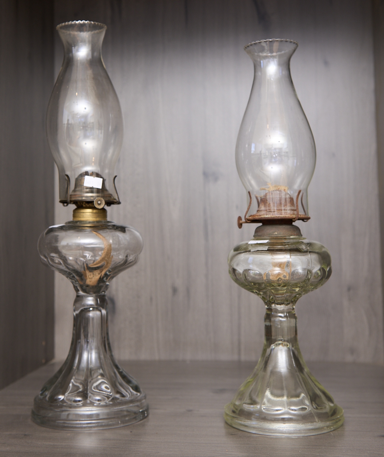 TWO PRESSED GLASS KEROSENE LAMPS WITH GLASS FLUES AND BRASS BURNERS H.48.5CM, LEONARD JOEL LOCAL DELIVERY SIZE: MEDIUM