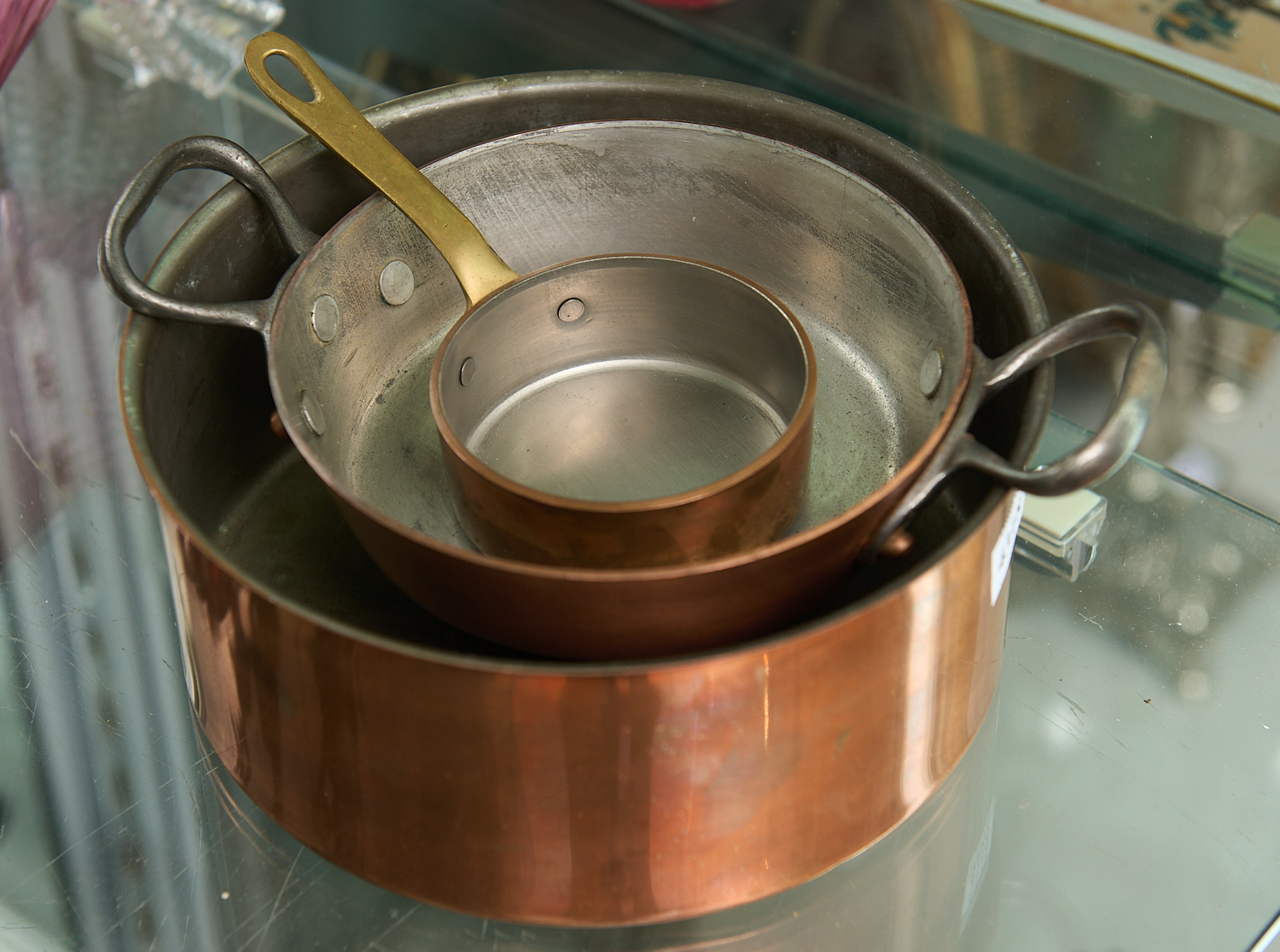 THREE VINTAGE FRENCH COPPER COOKING PANS INCLUDING SMALL SKILLET, DIA.19CM (LARGEST), LEONARD JOEL LOCAL DELIVERY SIZE: SMALL