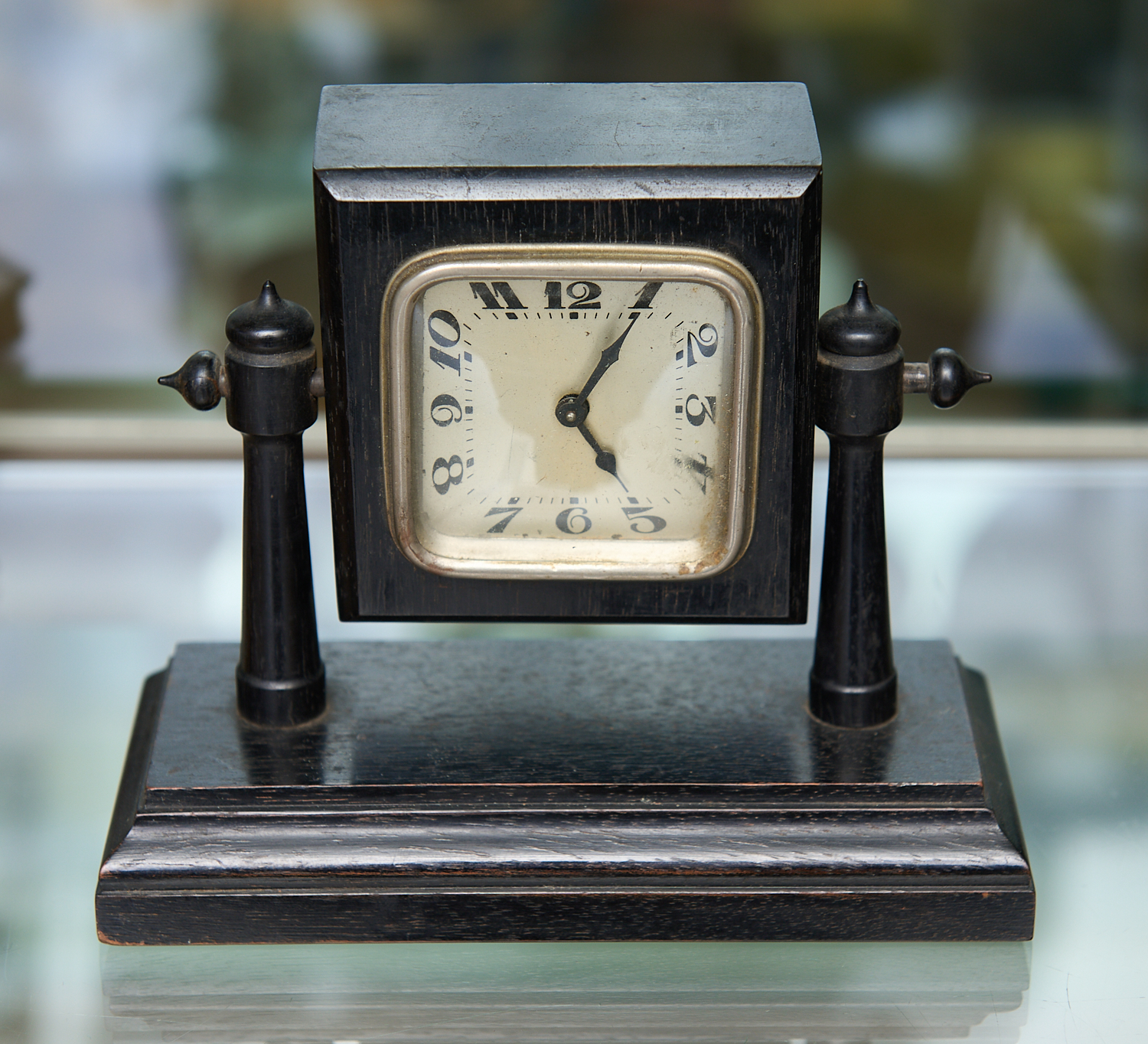 A WOODEN DESK CLOCK H.13.5 X W.15CM, LEONARD JOEL LOCAL DELIVERY SIZE: SMALL