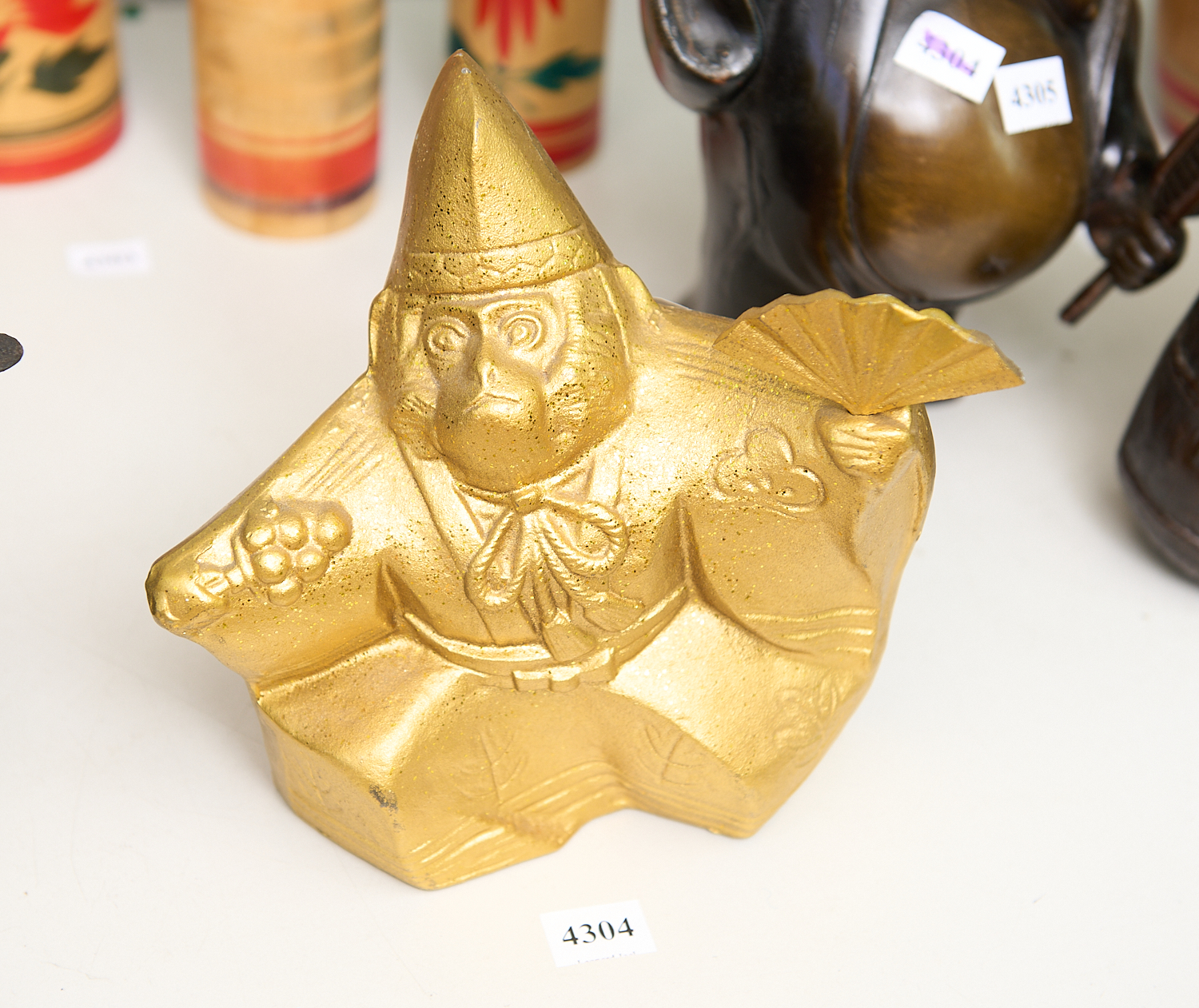 A GOLD COLOURED METAL MONKEY WITH FAN H.19CM, LEONARD JOEL LOCAL DELIVERY SIZE: SMALL