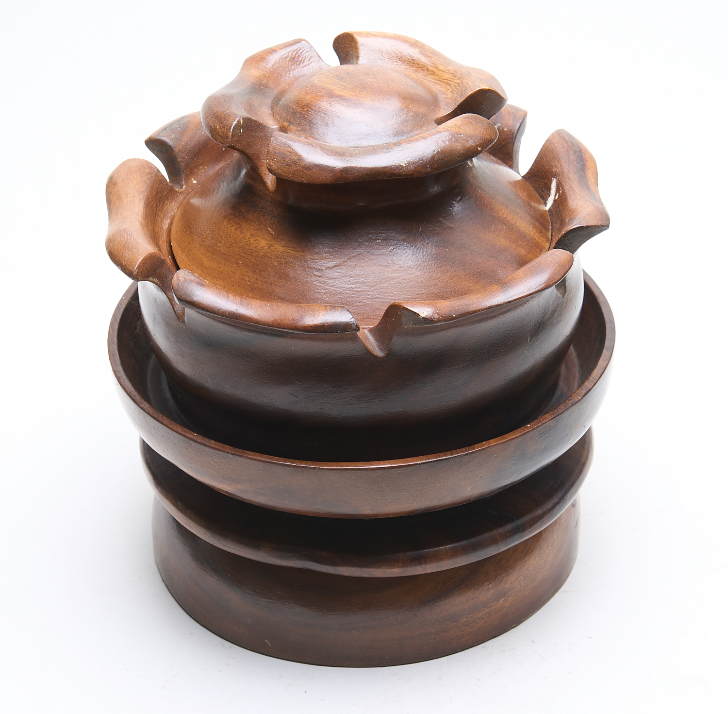 A TEAK LAZY SUSAN FORM STORAGE BOWL, H.28CM, LEONARD JOEL LOCAL DELIVERY SIZE: MEDIUM