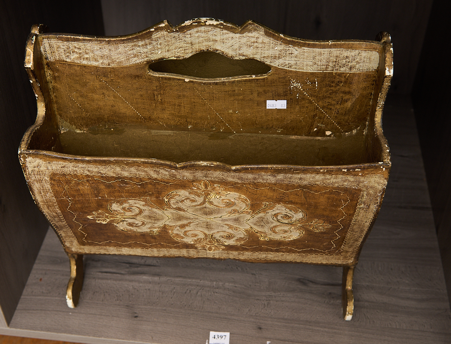 AN ITALIAN FLORENTINE GILTWOOD TWO SECTION MAGAZINE RACK, H.42 X 38CM, LEONARD JOEL LOCAL DELIVERY SIZE: MEDIUM