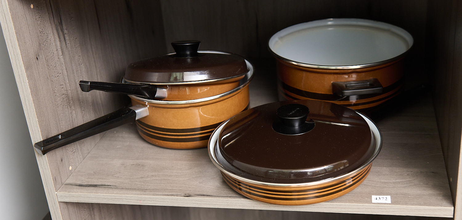 A GROUP OF VINTAGE ENAMEL HENDLERS POINTERWARE COOKWARE, LEONARD JOEL LOCAL DELIVERY SIZE: MEDIUM