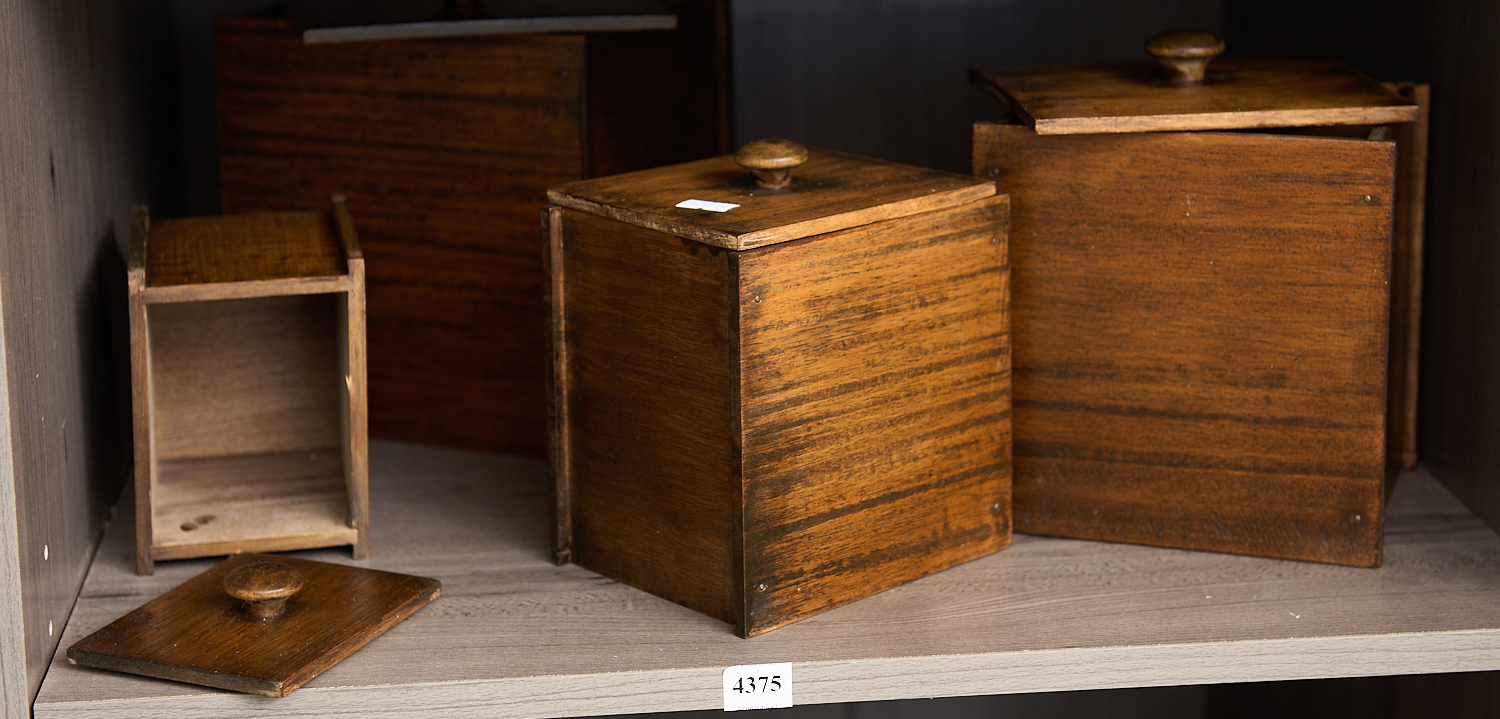 FOUR VINTAGE WOODEN KITCHEN CANNISTERS H.20CM (TALLEST), LEONARD JOEL LOCAL DELIVERY SIZE: SMALL