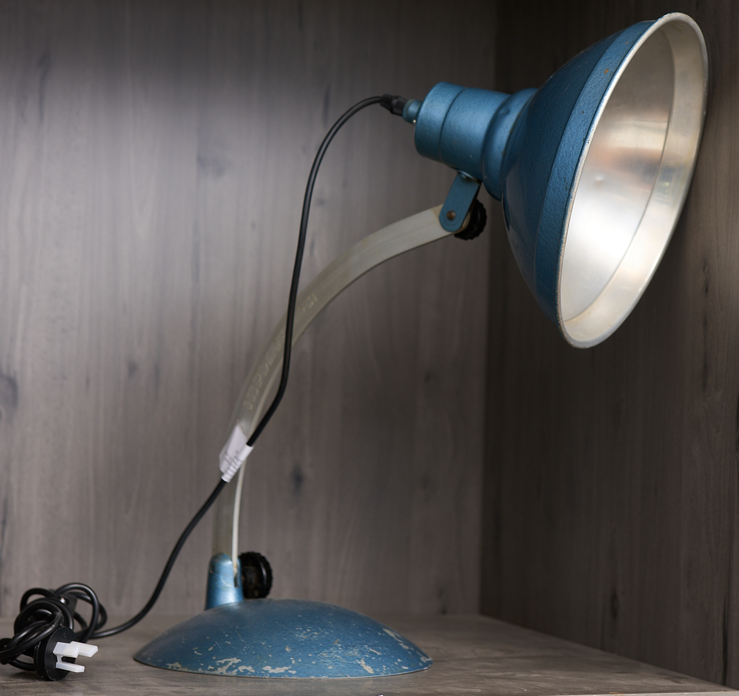 A VINTAGE RETRO CURVED ARM ANODISED SHADE INFRATHERM LAMP H.50CM, LEONARD JOEL LOCAL DELIVERY SIZE: MEDIUM