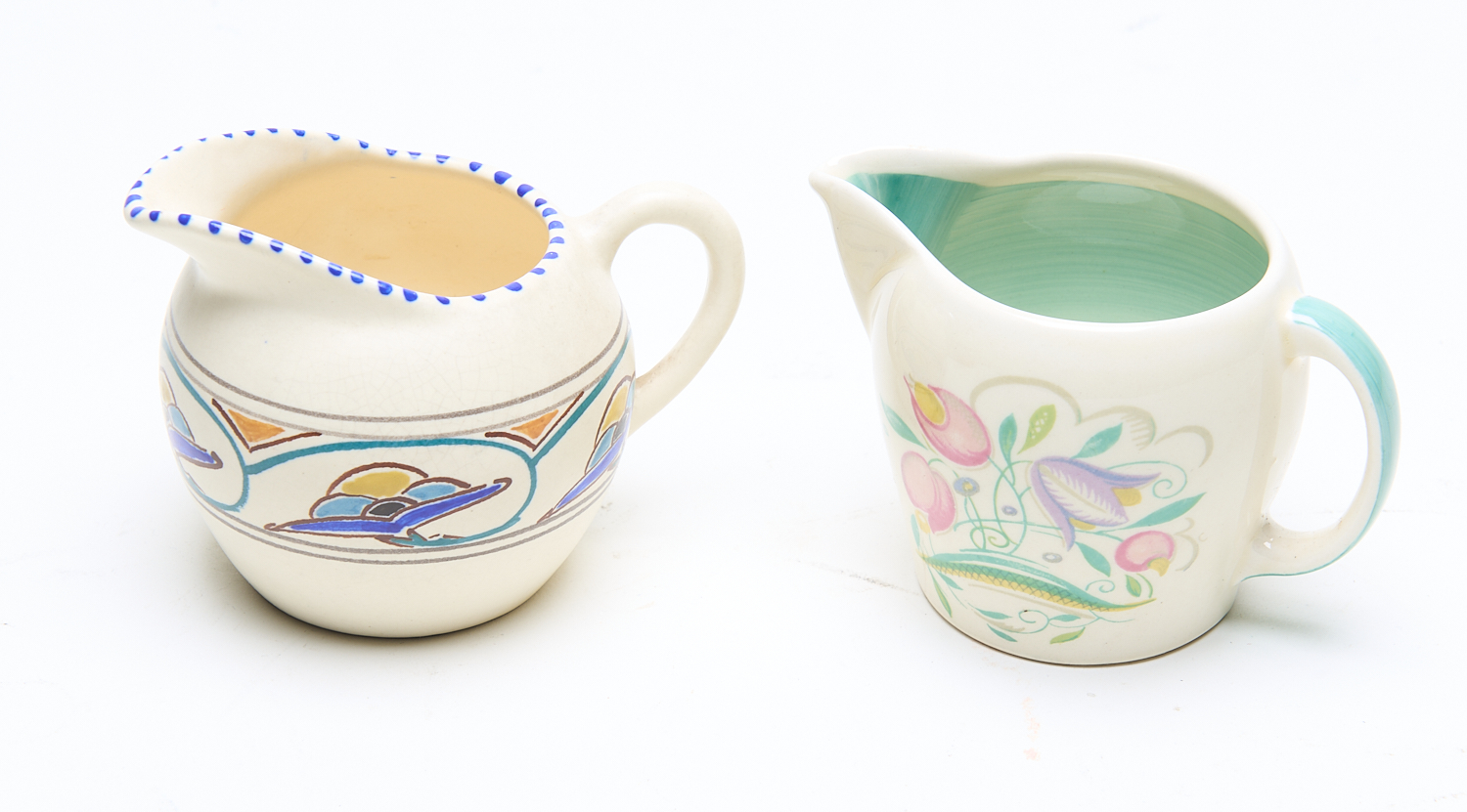 TWO RETRO JUGS INCLUDING SUSIE COOPER AND HAND PAINTED, H.15CM (TALLEST), LEONARD JOEL LOCAL DELIVERY SIZE: SMALL