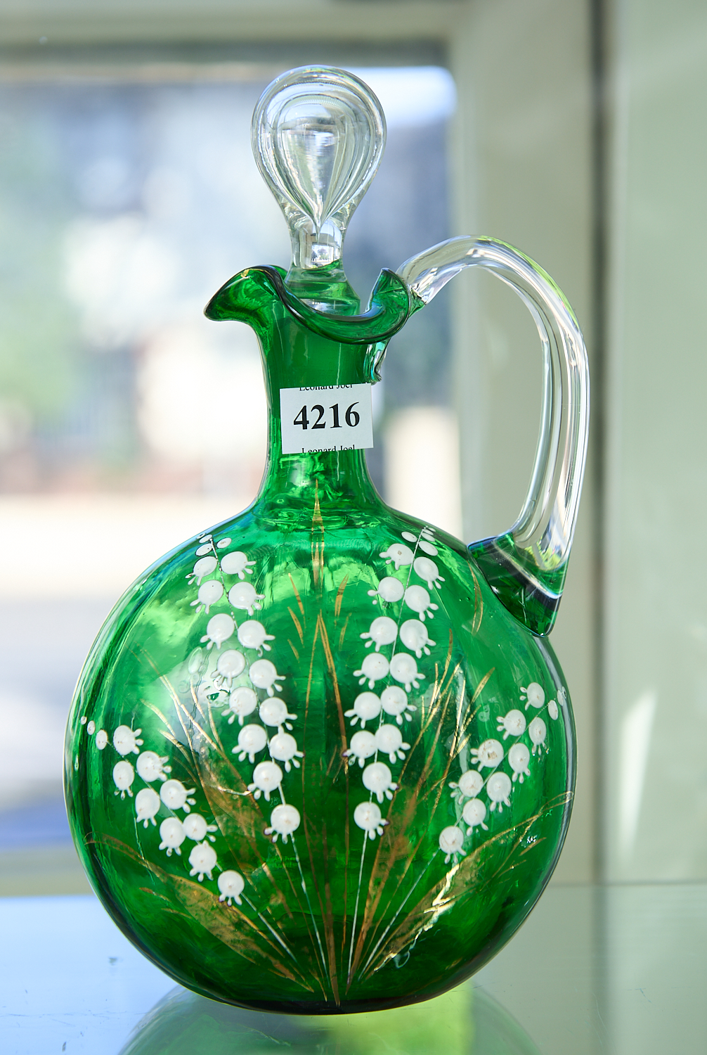 A VICTORIAN ENAMEL DECORATED GREEN AND CLEAR GLASS HANDLED DECANTER WITH STOPPER H.24.5CM, LEONARD JOEL LOCAL DELIVERY SIZE: SMALL