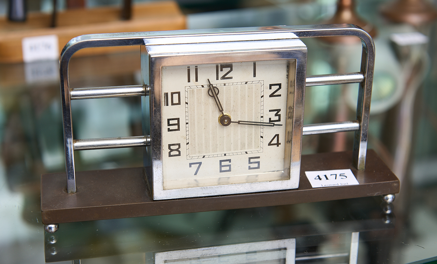 AN ART DECO CHROME AND BAKELITE DESK CLOCK (A/F MISSING ONE BALL FOOT) W.18.5CM, LEONARD JOEL LOCAL DELIVERY SIZE: SMALL