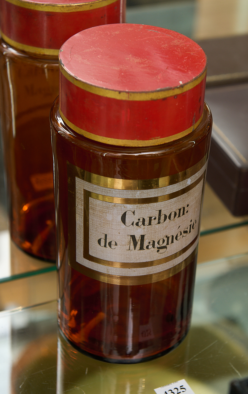 AN AMBER GLASS METAL LIDDED CHEMIST BOTTLE WITH ENAMEL LABEL H.24CM, LEONARD JOEL LOCAL DELIVERY SIZE: SMALL