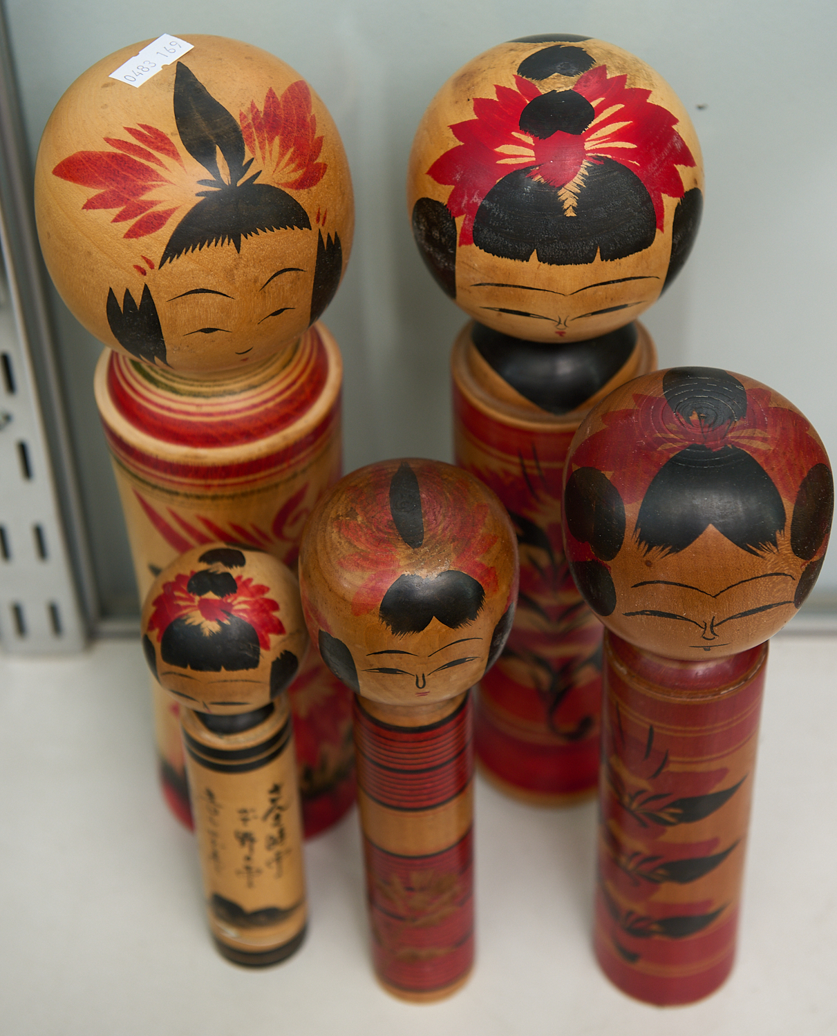 A COLLECTION OF FIVE VINTAGE HAND PAINTED KOKESHI DOLLS, LEONARD JOEL LOCAL DELIVERY SIZE: MEDIUM