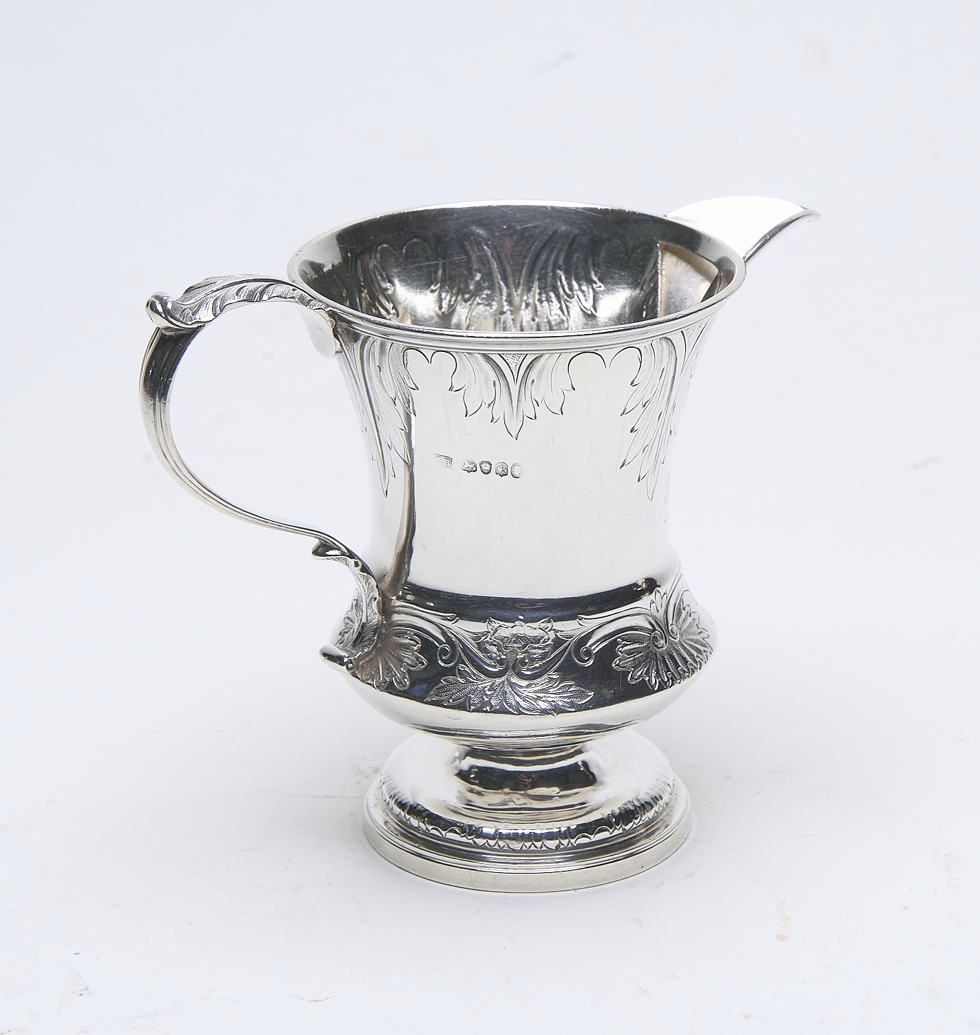 A GEORGIAN STERLING SILVER EMBOSSED JUG - 206 GRAMS H.11.5CM, LEONARD JOEL LOCAL DELIVERY SIZE: SMALL