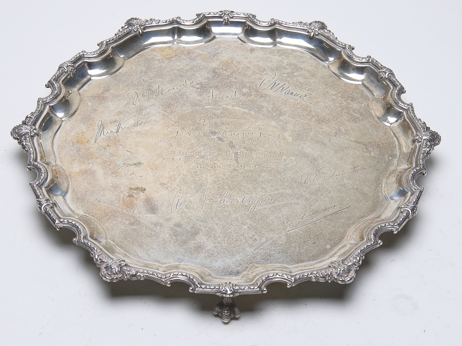 A STERLING SILVER SALVER ON CLAW FEET WITH PIE CRUST EDGE - ENGRAVING TO TOP, 1010 GRAMS DIA.31.5CM, LEONARD JOEL LOCAL DELIVERY SIZE: SMALL
