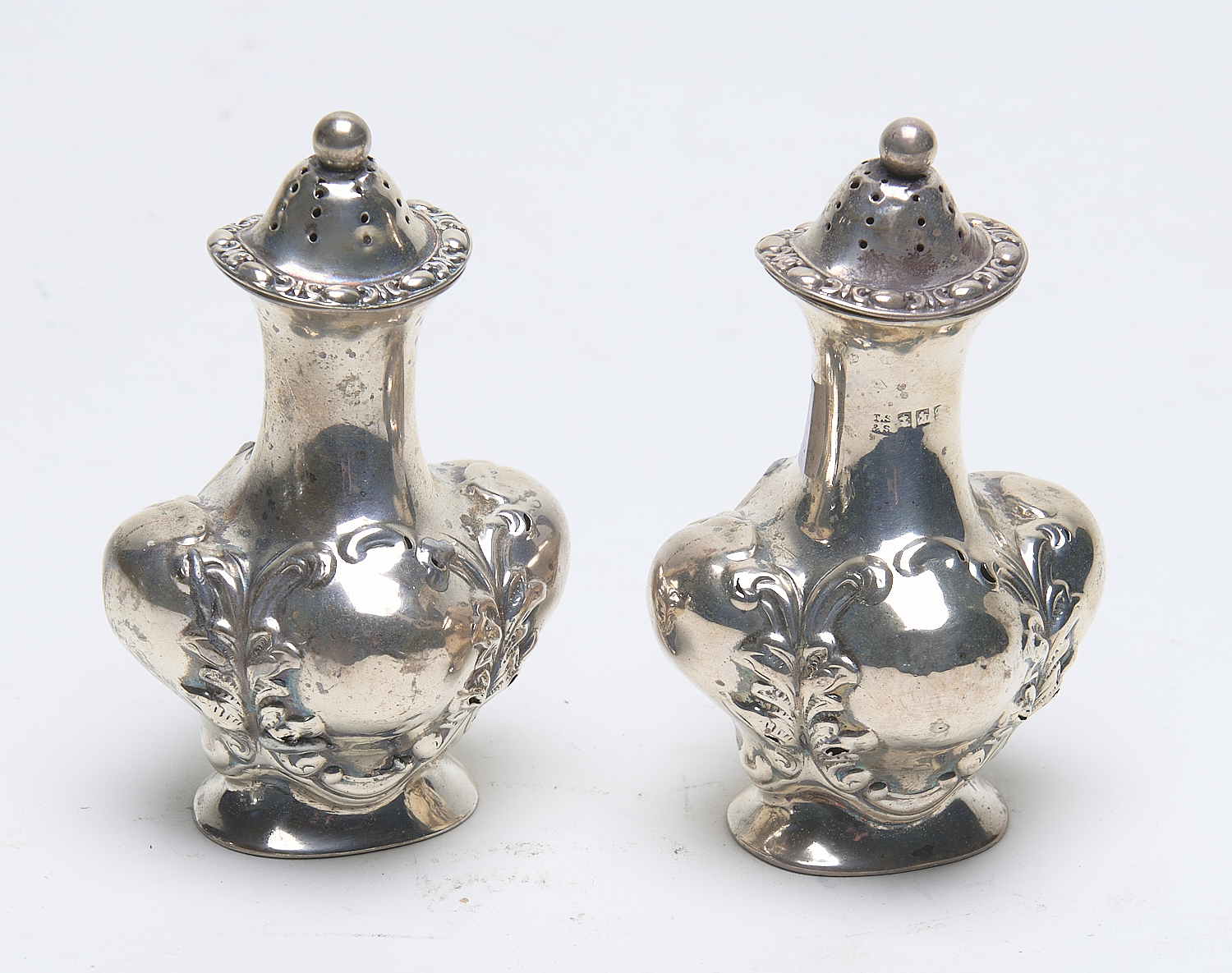 A PAIR OF STERLING SILVER PEPPER SHAKERS WITH FOLIATE DECORATION (A/F) H.9.5CM, LEONARD JOEL LOCAL DELIVERY SIZE: SMALL