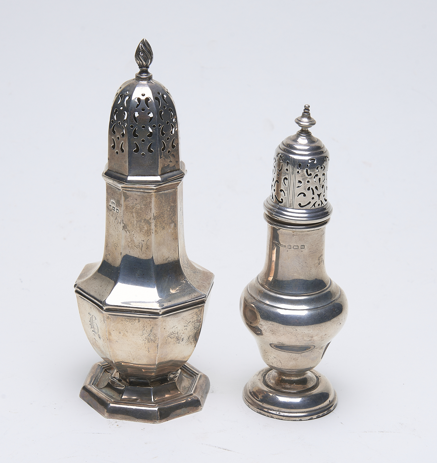 TWO STERLING SILVER SUGAR CASTORS, 255 GRAMS H.20.5CM, LEONARD JOEL LOCAL DELIVERY SIZE: SMALL