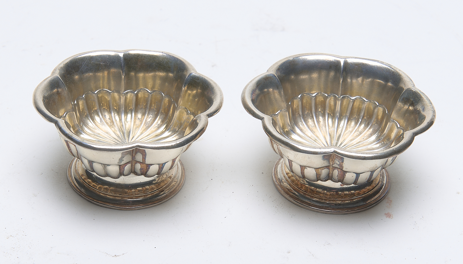 A PAIR OF STERLING SILVER OPEN SALTS, 54 GRAMS H.3CM X DIA.6CM, LEONARD JOEL LOCAL DELIVERY SIZE: SMALL