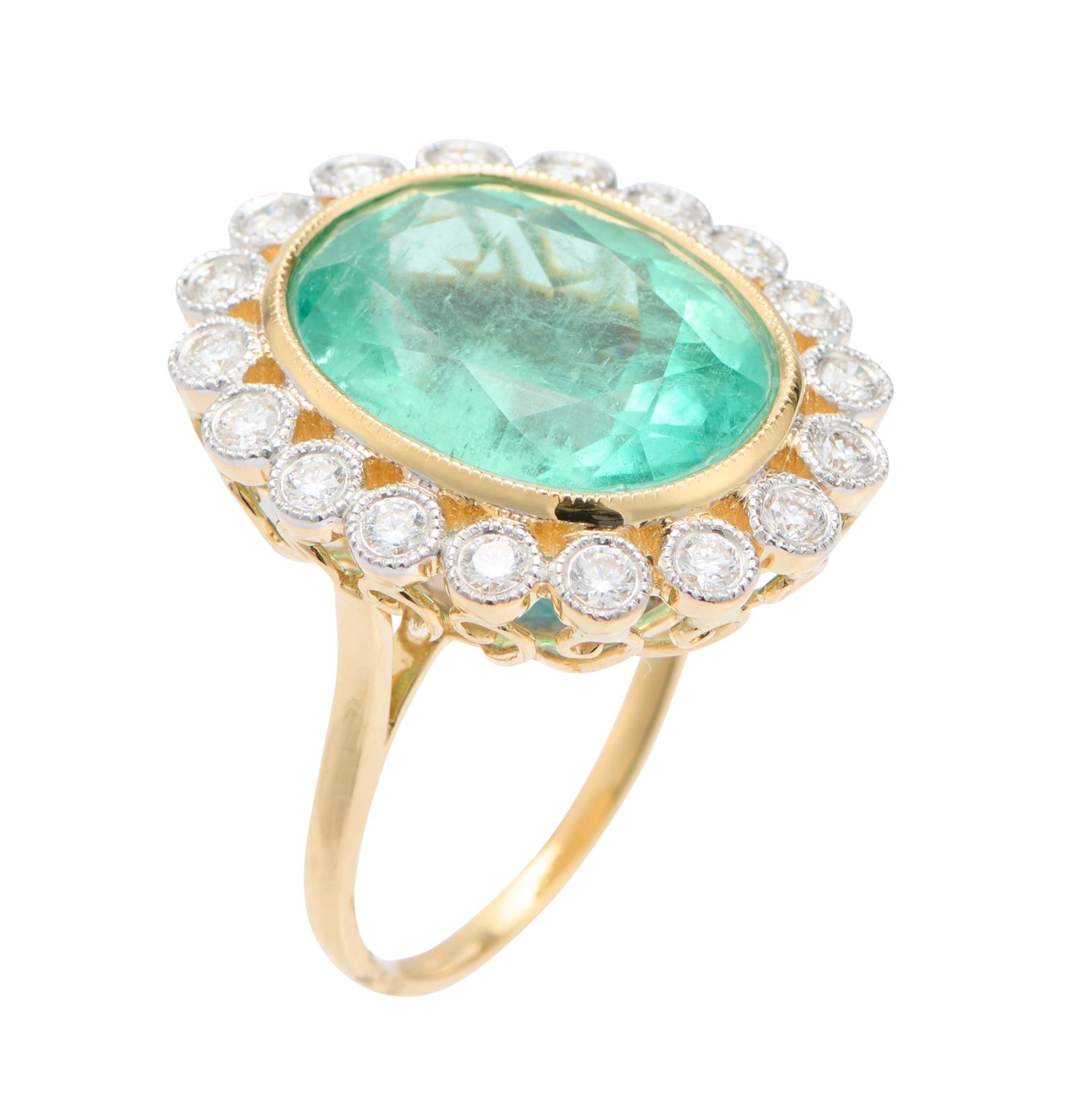 Centring a collet-set oval-cut emerald weighing 14.50 carats, within a surround of eighteen collet-set brilliant-cut diamonds together weighing 0.98 carats, size O.