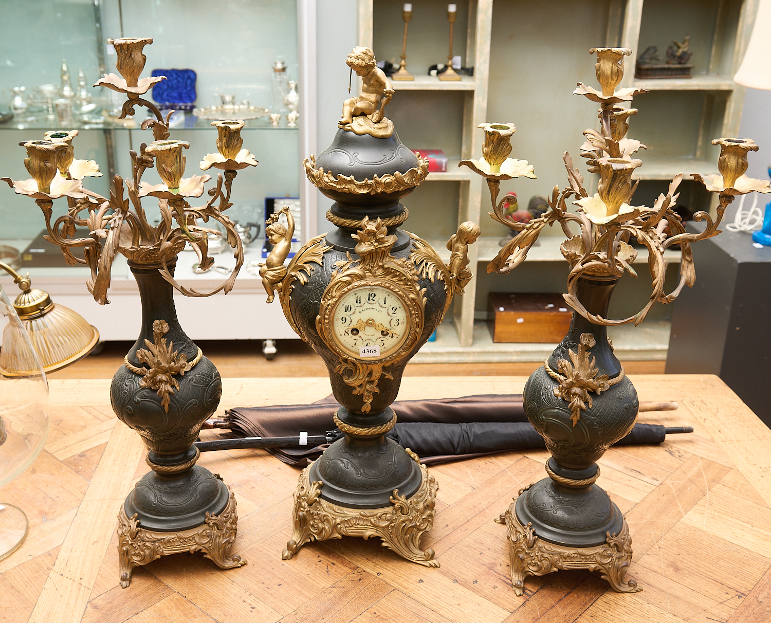 A 19TH C FRENCH THREE PIECE GILT BRONZE CLOCK GARNITURE WITH CHERUB FINIAL H.70CM, LEONARD JOEL LOCAL DELIVERY SIZE: MEDIUM