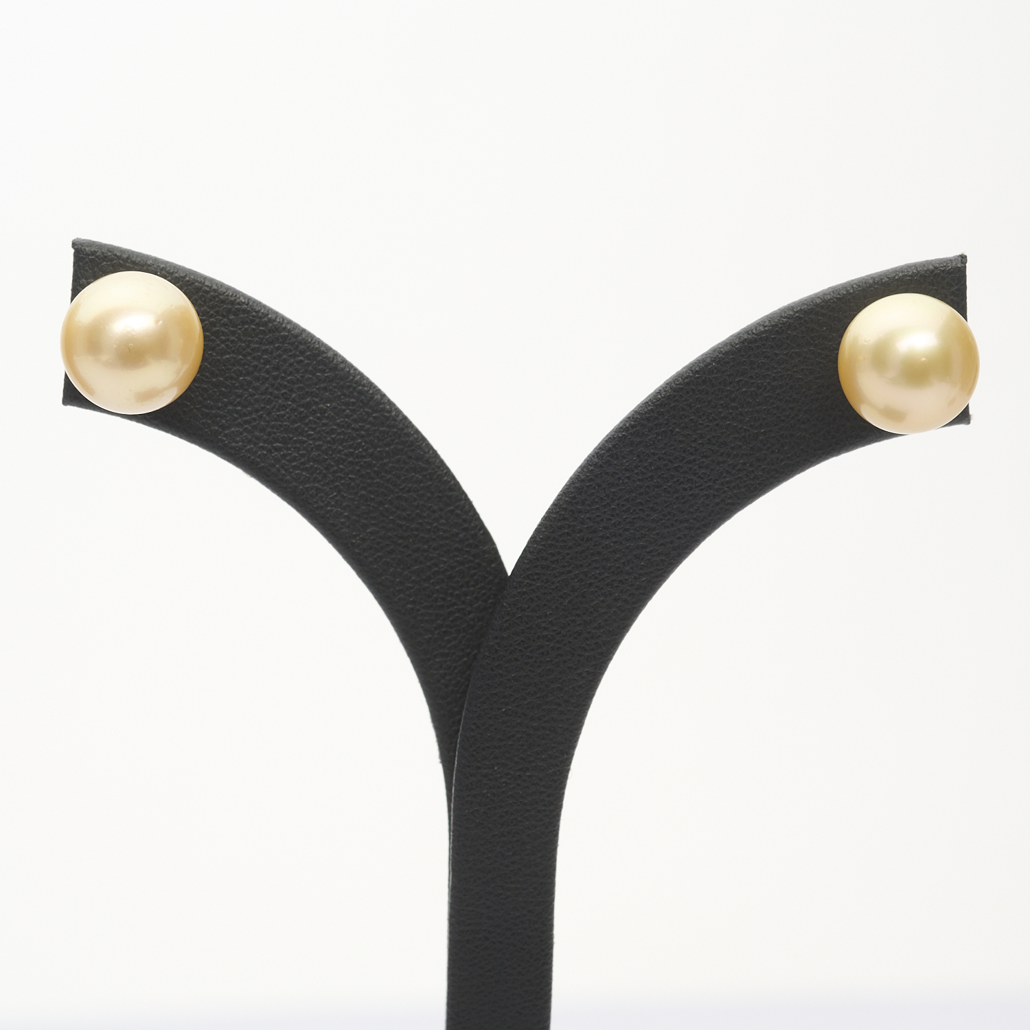 A PAIR OF GOLDEN SOUTH SEA PEARL EARRINGS, TO STUD FITTINGS IN 18CT GOLD, THE PEARLS MEASURING 11MM