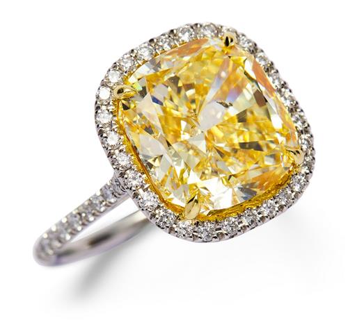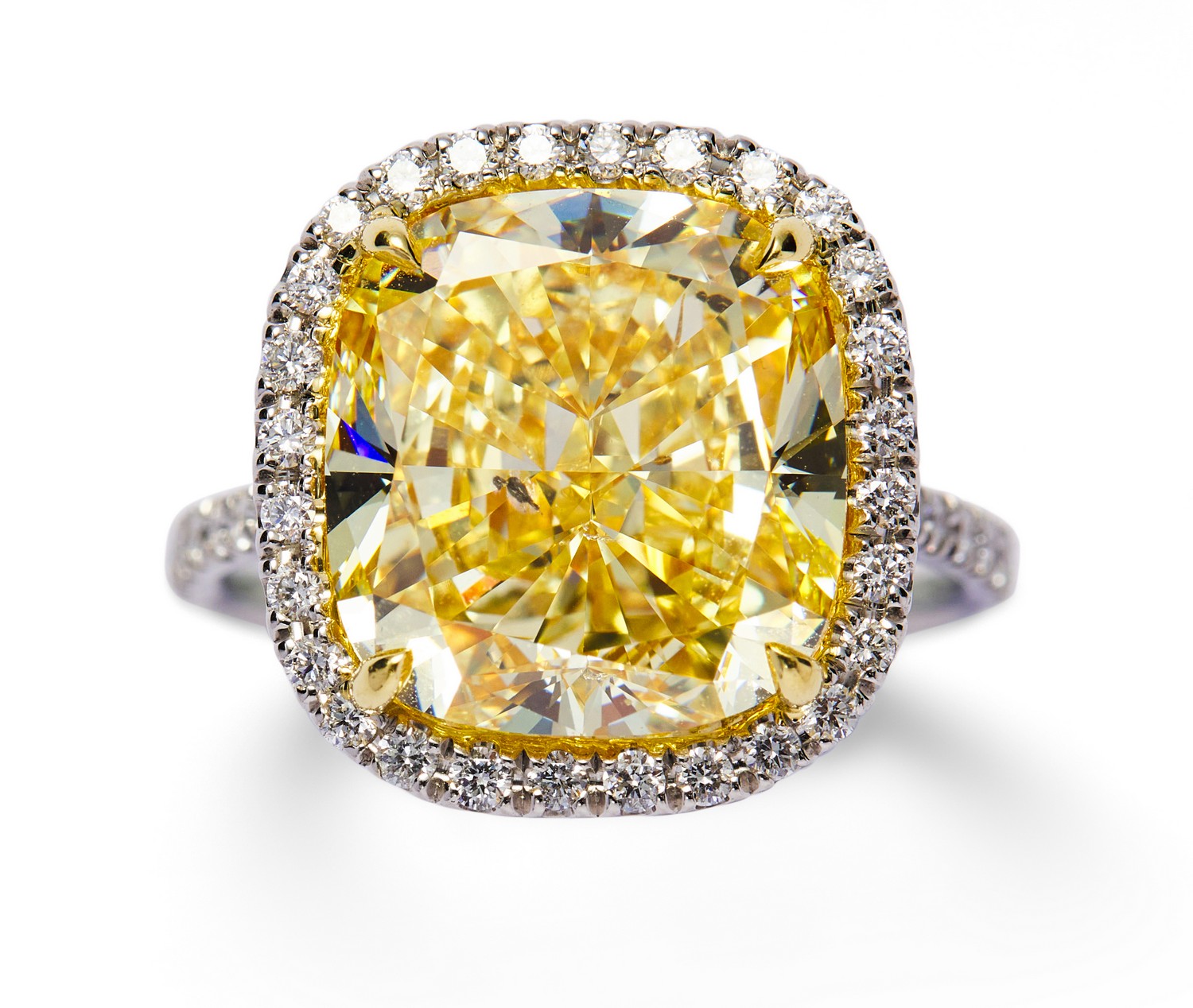Of cluster design, centering a claw-set cushion-shaped modified brilliant-cut fancy yellow diamond weighing 10.33 carats, framed by a halo of near colourless brilliant-cut diamonds, to similarly set shoulders, the 50 small diamonds together weighing approximately 0.54 carats, mounted in platinum and 18ct yellow gold, size M1/2.