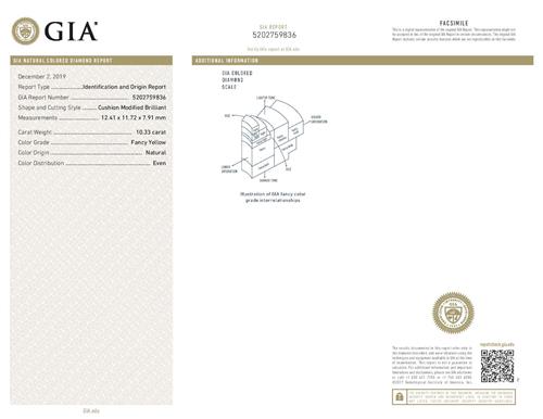 Accompanied by a GIA report numbered 5202759836, dated 2 December 2019, stating that the 10.33 carat diamond is natural, fancy yellow colour.