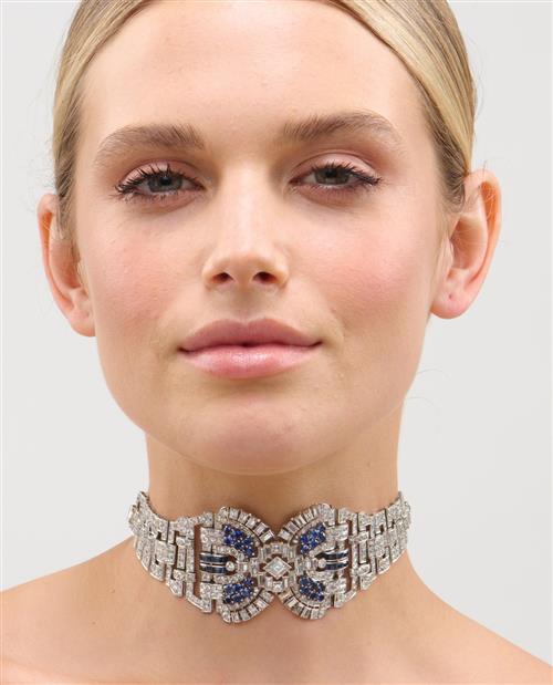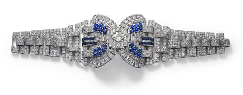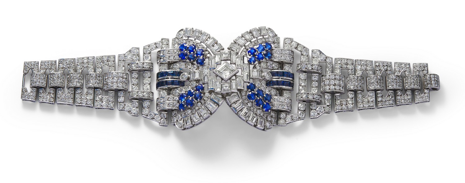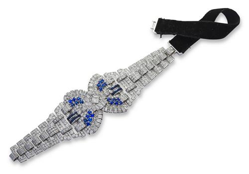 The Art Deco bracelet centring an openwork buckle motif decorated with baguette, swiss and circular-cut diamonds between carré and circular-cut sapphires is flanked by a tapering line of openwork geometric links embellished with circular-cut diamonds, the sapphires and diamonds together weighing approximately 5.76 carats and 13.52 carats respectively, mounted in platinum, circumference 175mm, accompanied by a later black ribbon and gold necklace attachment, total length 167mm.