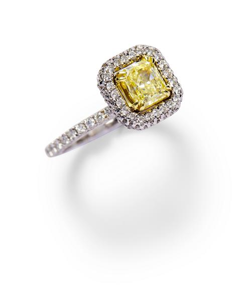 Of halo design, centering a claw-set cut-cornered rectangular modified brilliant-cut fancy light yellow diamond weighing 1.09 carats, framed by near colourless brilliant-cut diamonds, the gallery and shoulders pavé-set with diamonds, the small diamonds together weighing approximately 1.07 carats, mounted in 18ct white gold, size J1/2.
