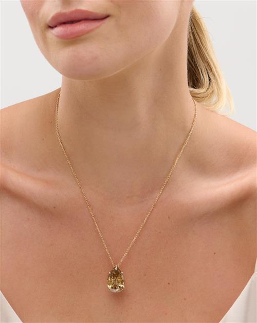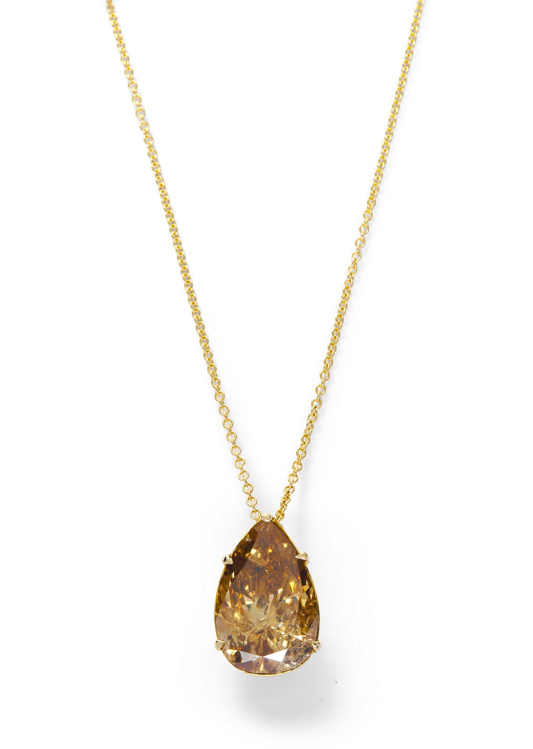 The claw-set fancy yellow-brown pear-shaped brilliant-cut diamond weighing 13.25 carats, is supported from a fine trace chain, mounted in 18ct gold, length 22mm, circumference 450mm.