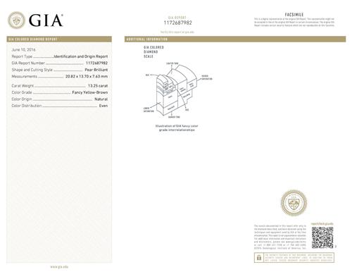 Accompanied by a GIA report numbered 1172687982, dated 10 June 2016, stating that the 13.25 carat diamond is natural, fancy yellow-brown colour.