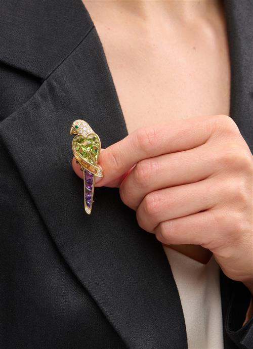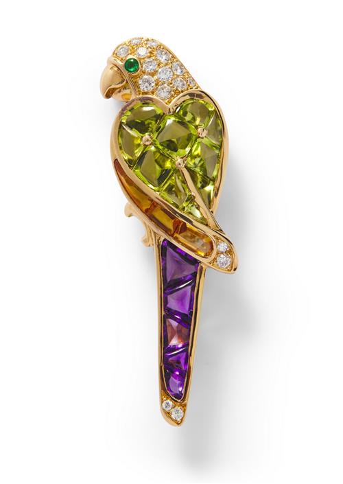 Designed as a stylised parrot, the wings and tail feathers embellished by calibré-cut buff top peridots, amethysts and citrines, the pavé-set diamond head accented by a circular-cut emerald eye, mounted in 18ct gold, length 55mm, trombone clip fitting, French assay marks, signed Piaget.