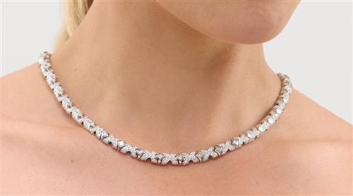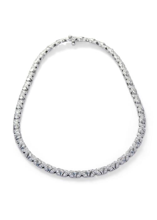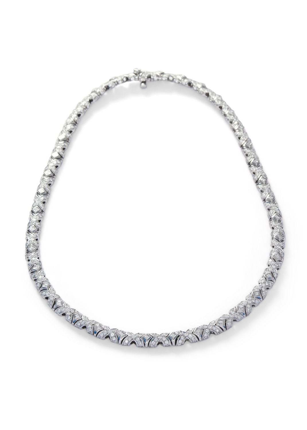 The articulated collar designed as a line of 'X' shaped links pavé-set with brilliant-cut diamonds alternating between geometric spacers applied with a collet-set carré-cut diamond, the diamonds together weighing approximately 10.00 carats, mounted in 18ct white gold, inner circumference 380mm, signed Bulgari.