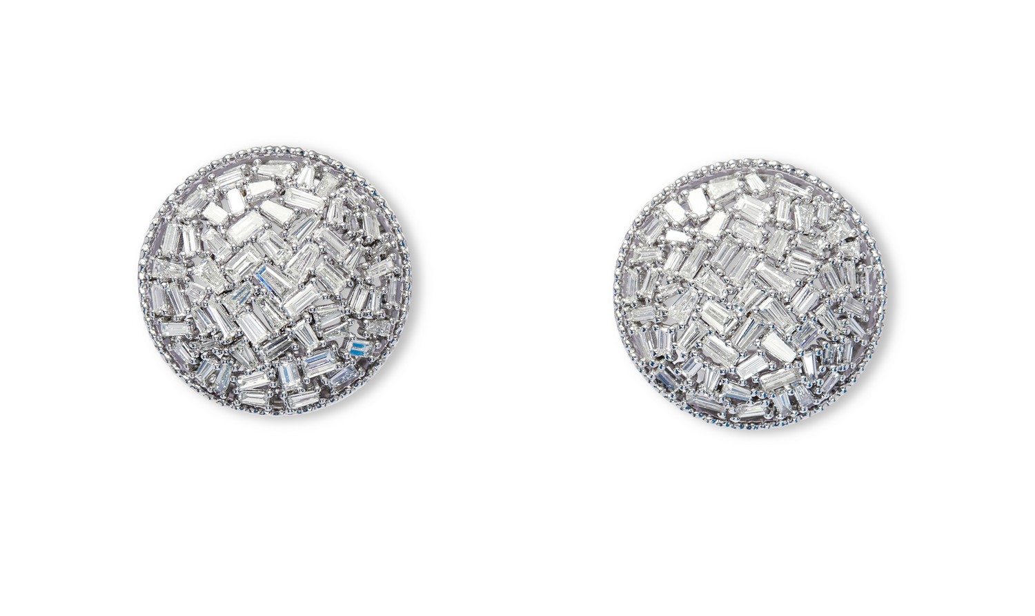 Each of circular design, claw-set with baguette diamonds framed by a millegrain edge, the diamonds together weighing approximately 3.00 carats, mounted in 18ct white gold, diameter 20mm, post and clip fittings.