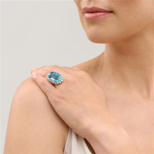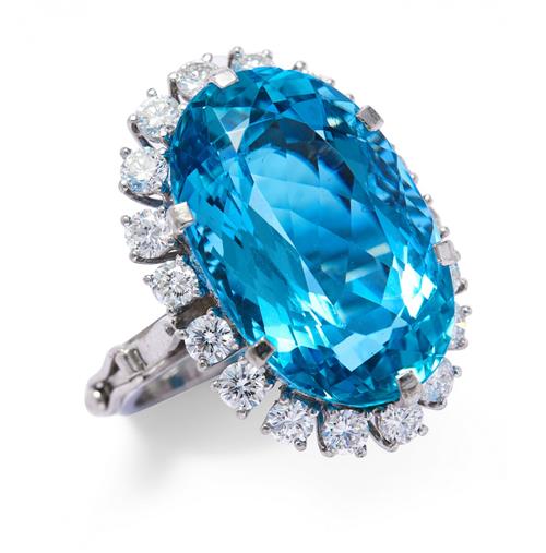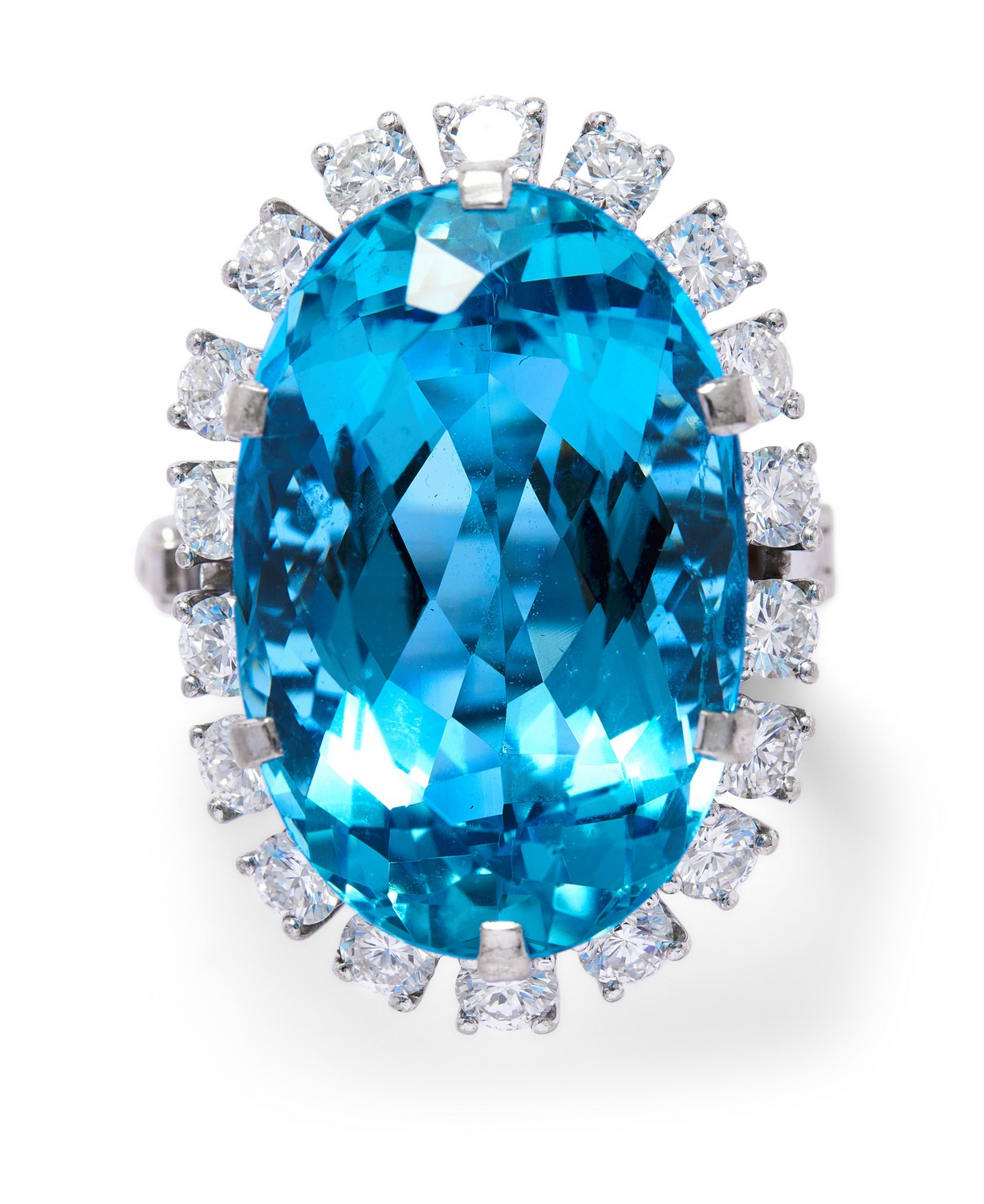Of cluster design, centering a claw-set oval aquamarine weighing approximately 21.05 carats, framed by a line of 18 similarly-set brilliant-cut diamonds supported from an elaborate wire work gallery, the diamonds together weighing approximately 1.57 carats, mounted in 18ct white gold, hinged shank, size N.