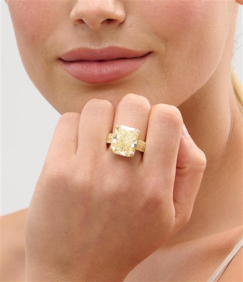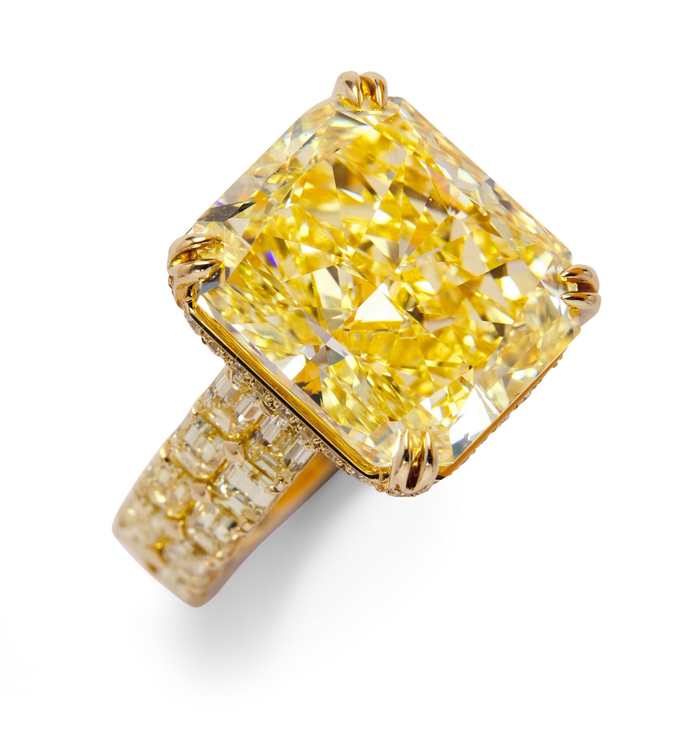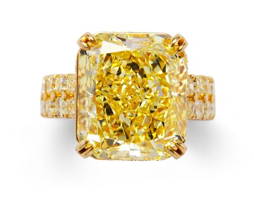 The fancy yellow cut-cornered rectangular modified brilliant-cut diamond weighing 15.51 carats, is claw-set above a gallery pavé-set with fancy yellow brilliant-cut diamonds and a pair of claw-set Argyle natural fancy pink brilliant-cut diamonds between shoulders decorated with a double line of natural fancy yellow baguette diamonds, the small yellow and pink diamonds together weighing 3.85 carats and 0.07 carats respectively, mounted in 18ct gold, size L1/2.