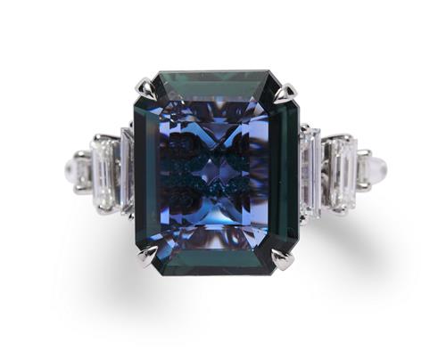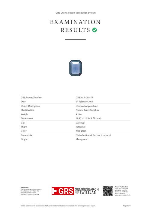 Accompanied by a GRS report numbered GRS2019-011875, dated 1 February 2019, stating that the 9.24 carat sapphire is natural, of blue-green colour, with no indications of heating.