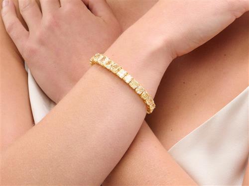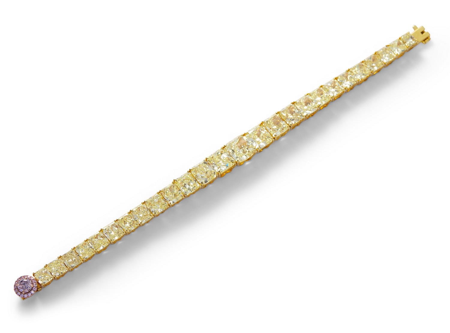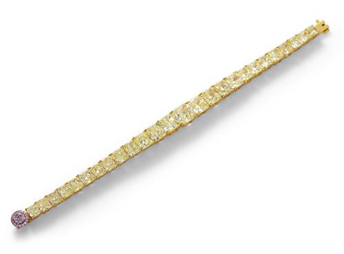 Composed of a graduated line of 26 claw-set fancy intense yellow, fancy yellow and fancy light yellow cut-cornered rectangular modified brilliant-cut diamonds together weighing 38.26 carats, the bracelet decorated to the reverse in an openwork architectural motif highlighted with a collet-set Argyle fancy pink diamond, completed by a circular box clasp of cluster design centering a claw-set Argyle fancy purplish pink round brilliant-cut diamond weighing 0.53 carat, framed by Argyle fancy pink diamonds, the small pink diamonds together weighing approximately 0.27 carats, mounted in 18ct gold, length 170mm.