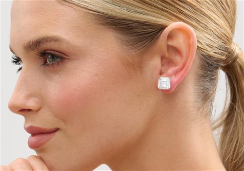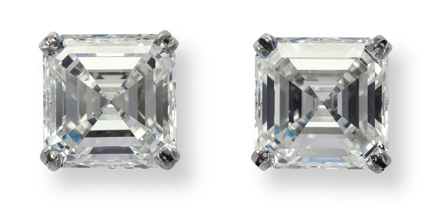 The square emerald-cut diamonds weighing 5.70 carats and 5.60 carats respectively, are claw-set above a gallery pavé-set with brilliant-cut diamonds, the small diamonds together weighing approximately 0.21 carat, mounted in platinum, post fittings.