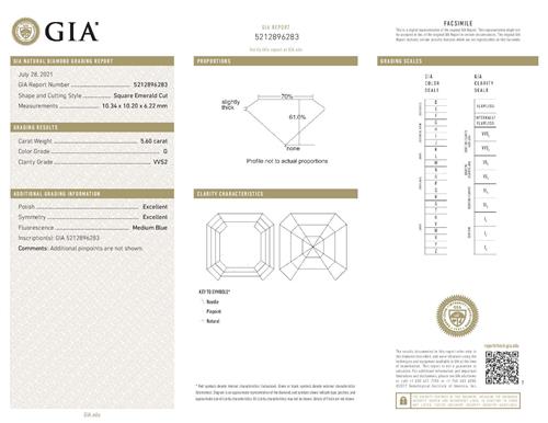 a GIA report numbered 5212896283, dated 28 July 2021, stating that the 5.60 carat diamond is natural, G colour, VVS2 clarity, laser inscribed.