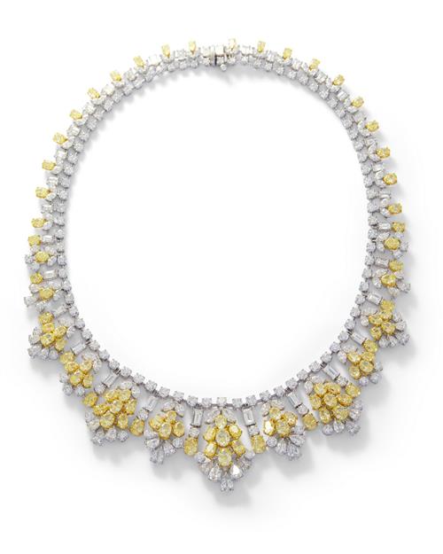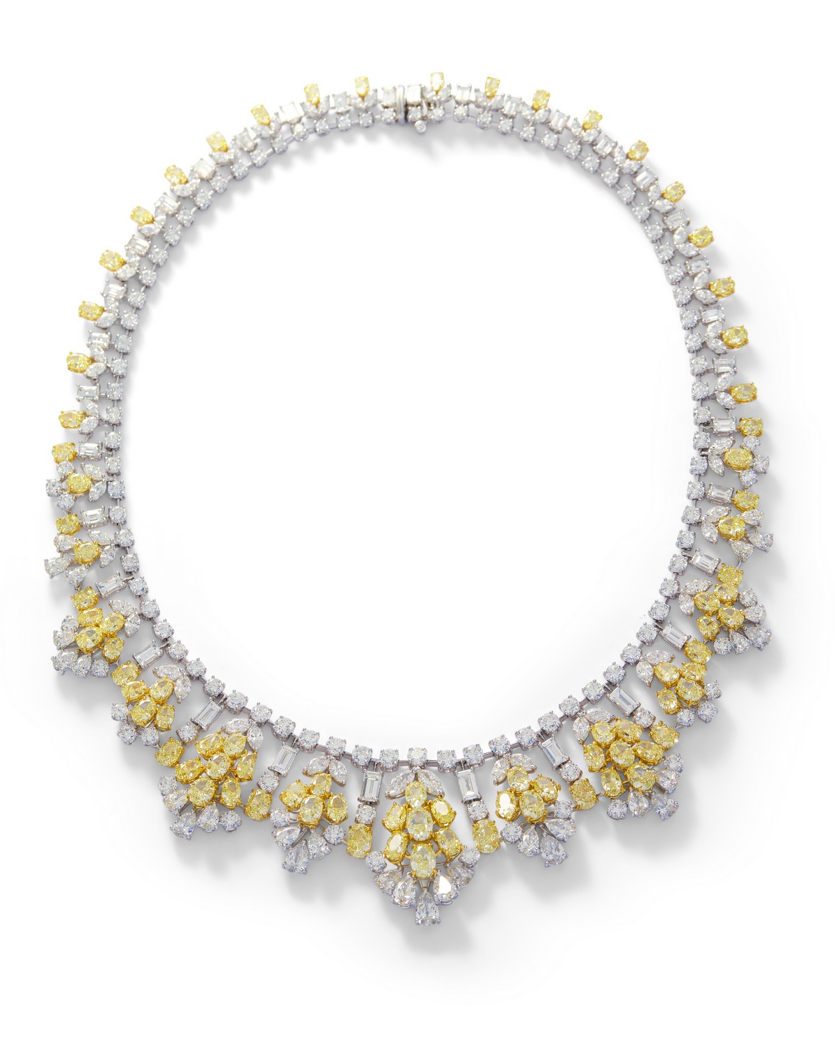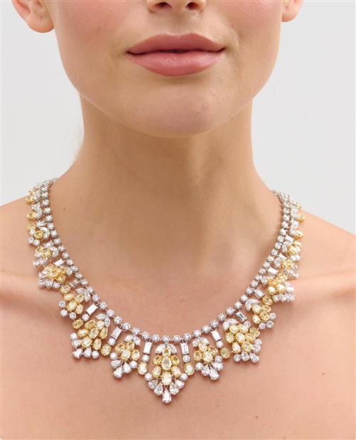 Comprising a continuous line of claw-set brilliant-cut diamonds supporting a cascading fringe of clusters decorated with fancy yellow oval diamonds and near colourless brilliant-cut, baguette, pear and marquise-shaped diamonds between similarly set vertical spacers, the fancy yellow and near colourless diamonds together weighing approximately 40.37 carats and 47.14 carats respectively, mounted in 18ct gold, inner circumference 410mm.