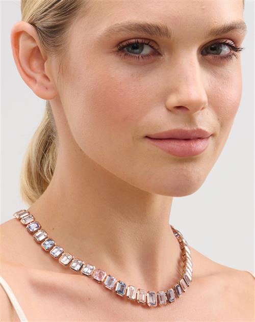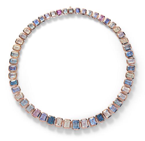 The collier designed as a line of 51 collet-set multi-coloured octagonal step-cut sapphires completed by a box clasp accented with a brilliant-cut diamond, the sapphires together weighing 91.63 carats, mounted in 18ct pink gold, inner circumference 390mm.