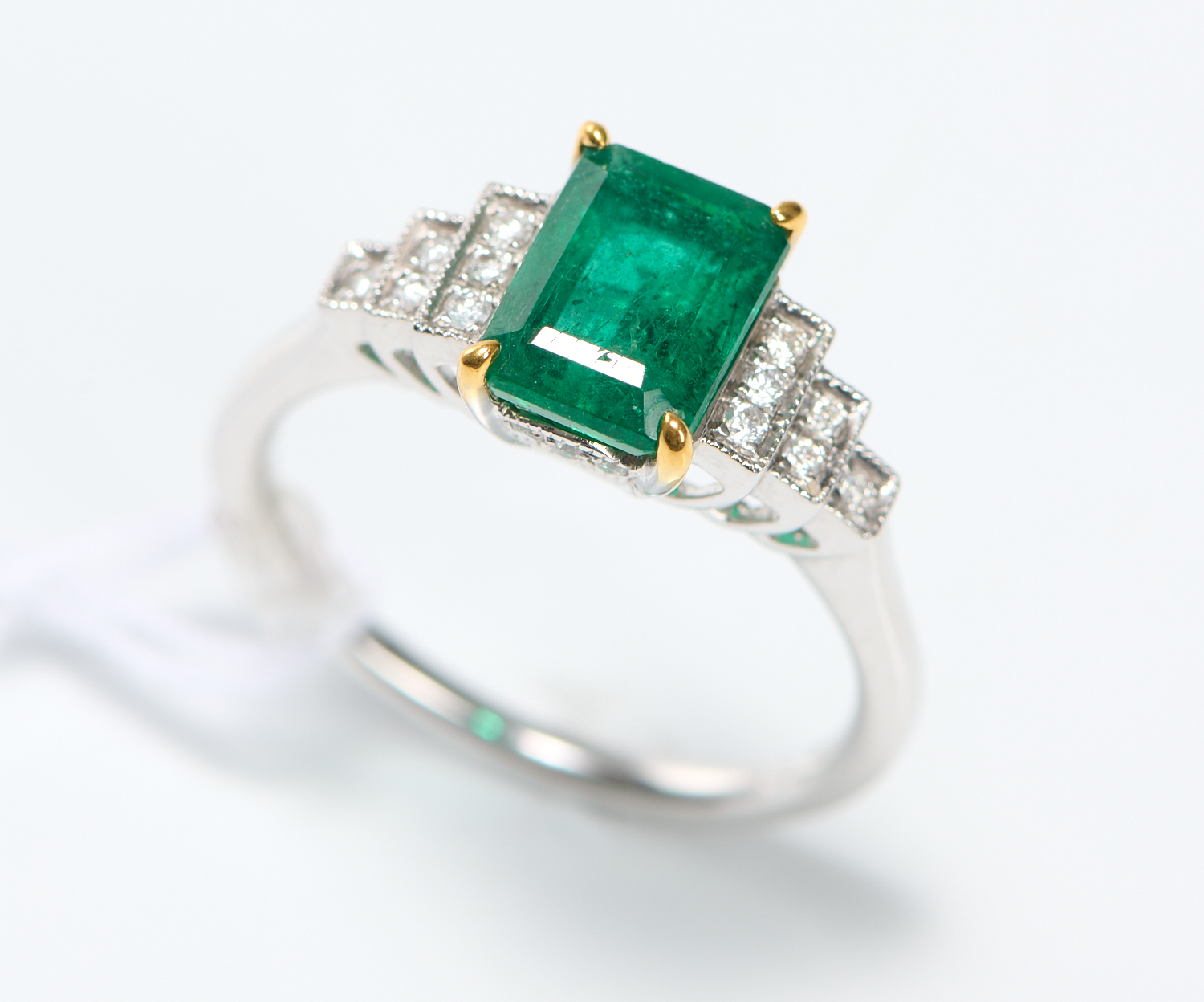 AN EMERALD AND DIAMOND SET RING IN 18CT WHITE GOLD, THE EMERALD TOTALLING 1.58CTS, WITH DIAMONDS TOTALLING 0.11CTS, RING SIZE L/M, 3.21GMS