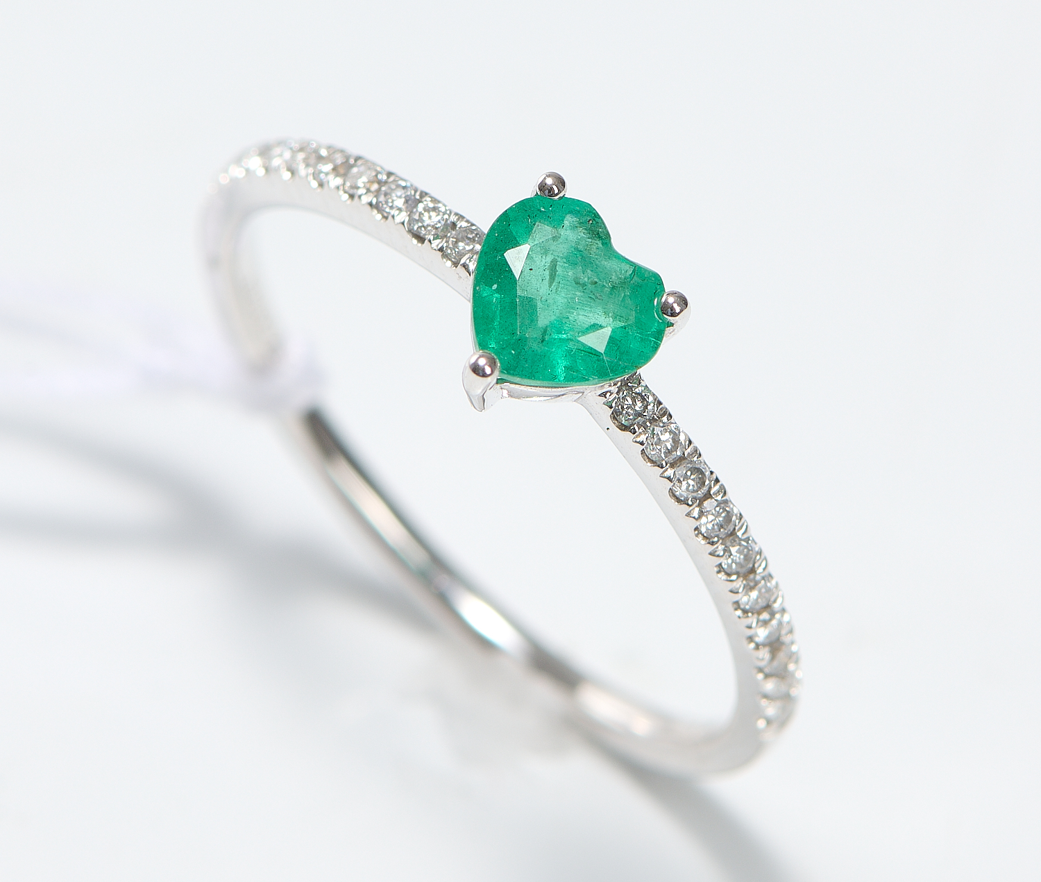 AN EMERALD AND DIAMOND SET RING IN 18CT WHITE GOLD, THE EMERALD TOTALLING 0.37CTS, AND DIAMONDS TOTALLING 0.10CTS, 1.38GMS