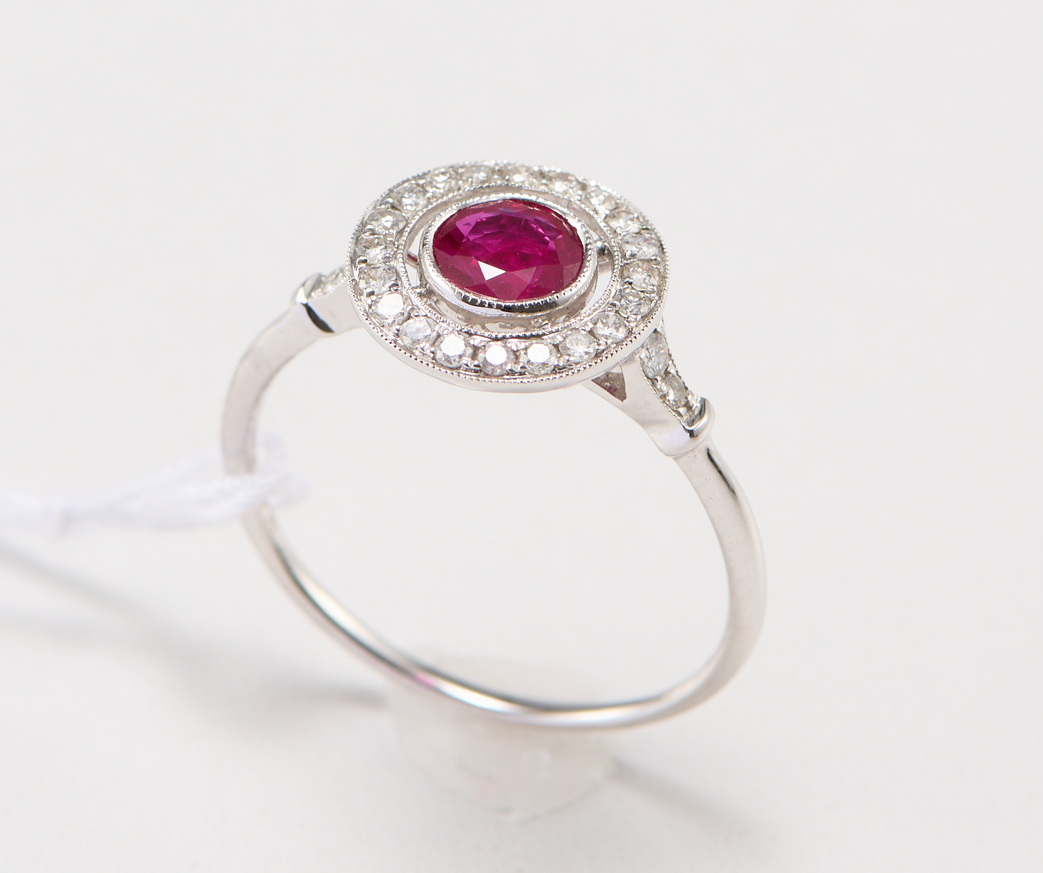 A RUBY AND DIAMOND RING IN 18CT WHITE GOLD, THE RUBY WEIGHING 0.55CTS, WITH SURROUNDING DIAMONDS TOTALLING 0.21CTS, RING SIZE L/M, 1.71GMS