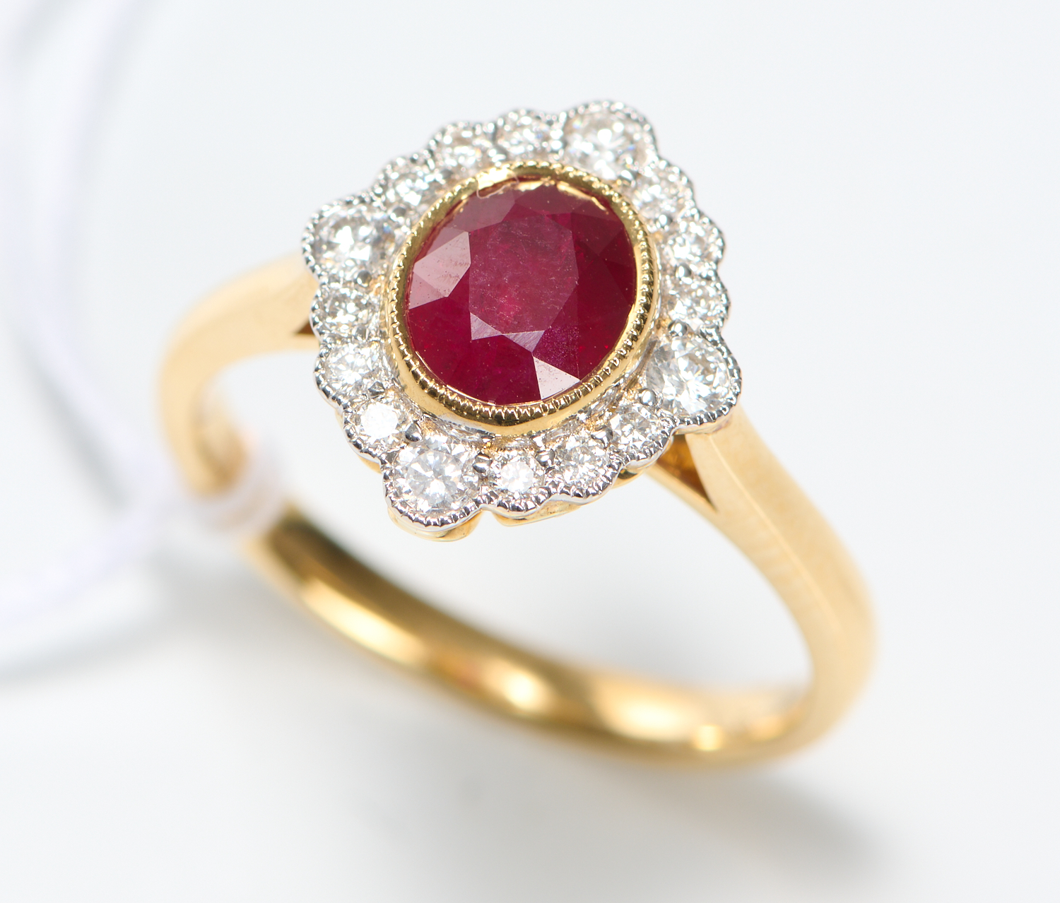 A RUBY AND DIAMOND SET RING IN 18CT GOLD, THE RUBY TOTALLING 1.24CTS, WITH SURROUNDING DIAMONDS TOTALLING 0.28CTS, RING SIZE L/M