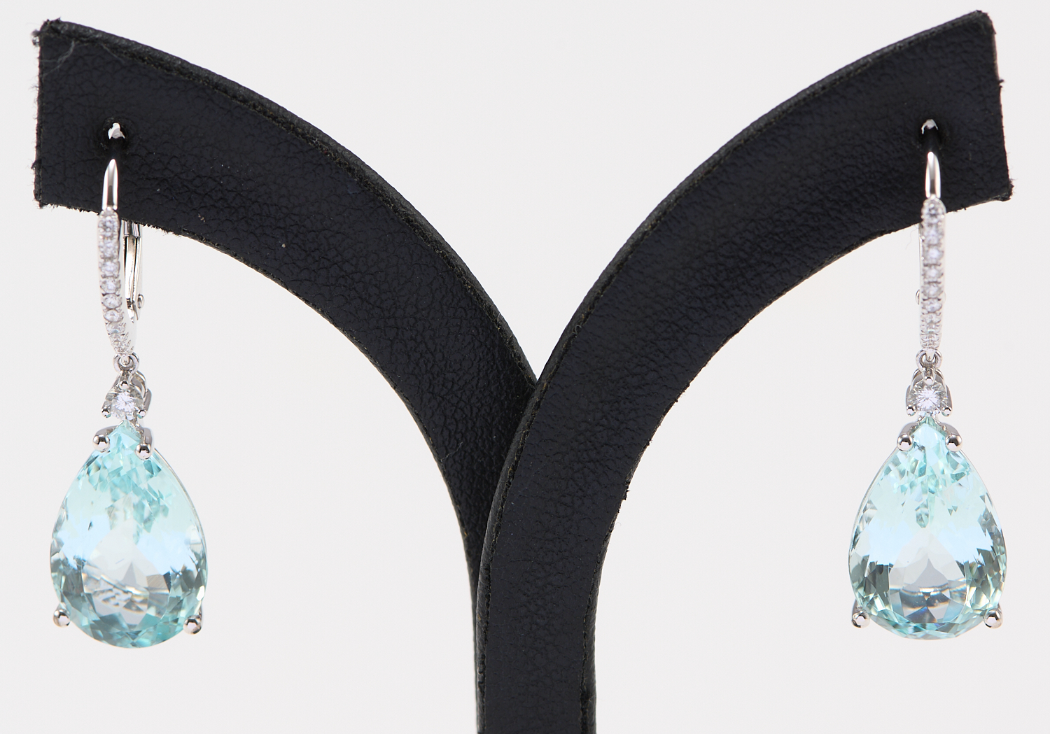 A PAIR OF AQUAMARINE AND DIAMOND EARRINGS IN 18CT WHITE GOLD, TO EUROPEAN HOOK FITTINGS, THE AQUAMARINE TOTALING 10.97CTS, THE DIAMONDS TOTALING 0.24CT, LENGTH 30MM, 3.44GMS