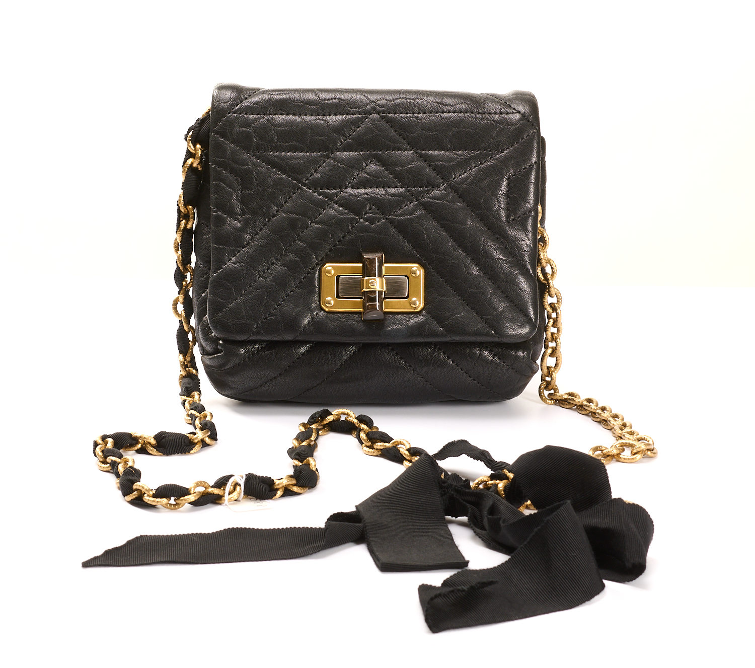 A HAPPY MINI POP CROSSBODY BAG BY LANVIN - Styled in black quilted calfskin, with gold toned textured chain strap, turnlock closure and signature Lanvin grosgrain ribbon and logo charm, 15 x 16 x 5cm.