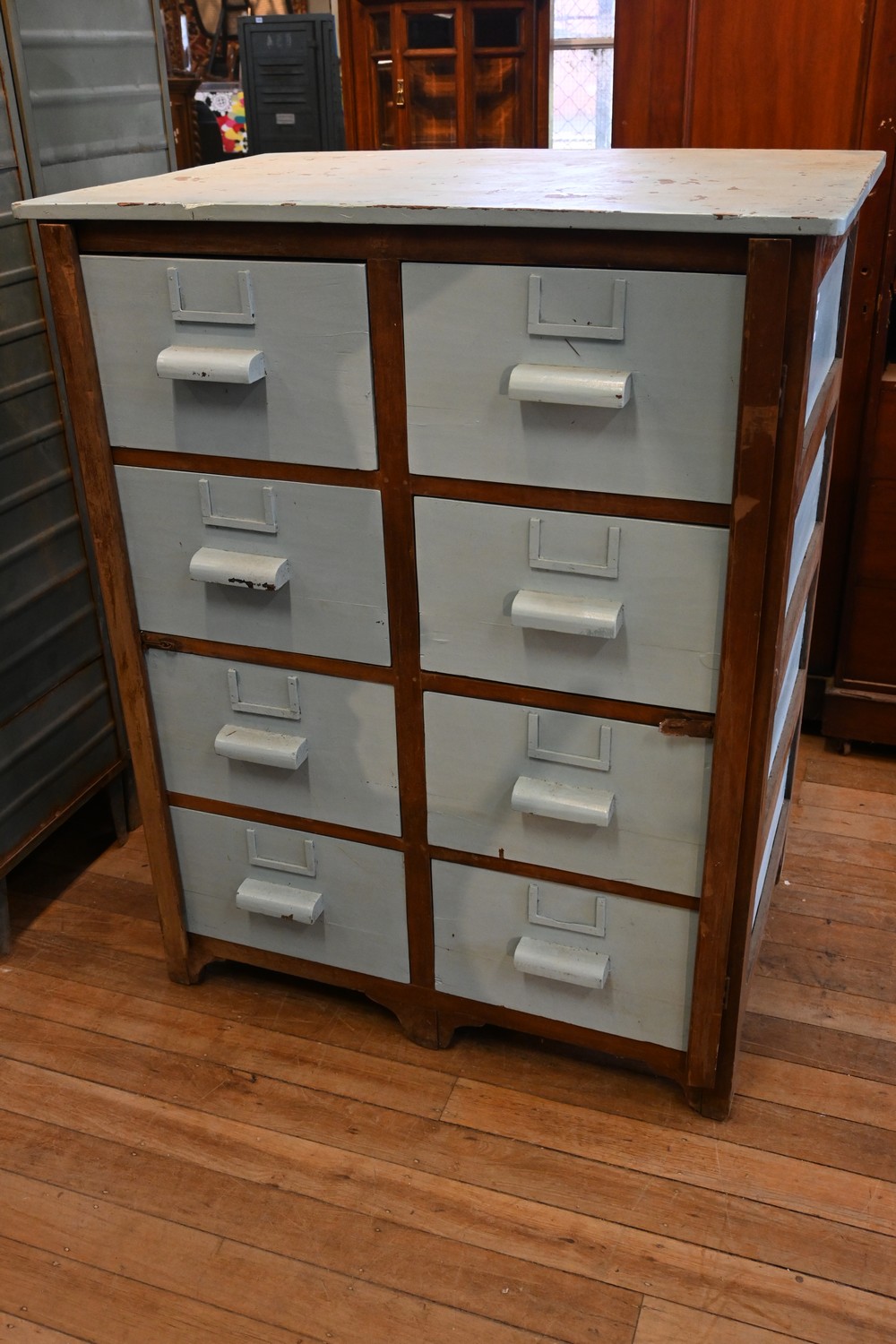 A SUBSTANTIAL SET OF EIGHT TIMBER FILING DRAWERS (A/F) (147H X 117W X 79D CM) (PLEASE NOTE THIS HEAVY ITEM MUST BE REMOVED BY CARRIERS AT THE CUSTOMER'S EXPENSE. LEONARD JOEL STAFF CANNOT ASSIST CARRYING THIS ITEM) (X-LARGE ITEM)