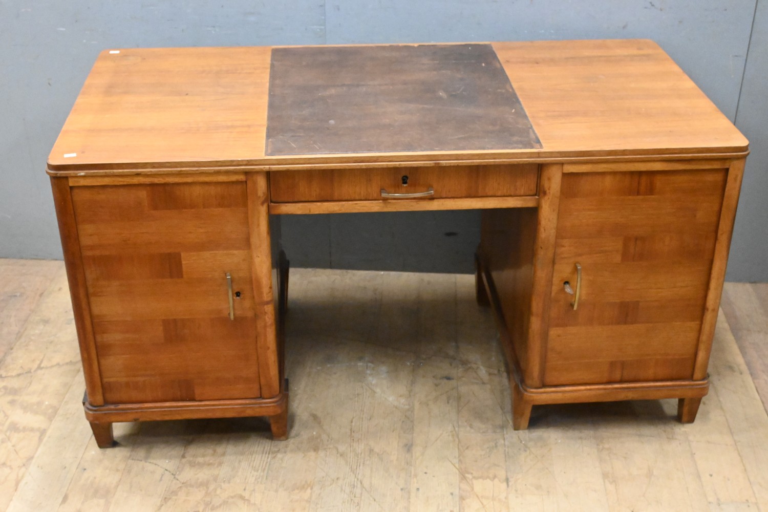 A FRENCH ART DECO ROSEWOOD AND OAK LEATHER INSET DESK, CIRCA 1940S (A/F) (75H X 139W X 70D CM) (PLEASE NOTE THIS HEAVY ITEM MUST BE REMOVED BY CARRIERS AT THE CUSTOMER'S EXPENSE. LEONARD JOEL STAFF CANNOT ASSIST CARRYING THIS ITEM) (X-LARGE ITEM)