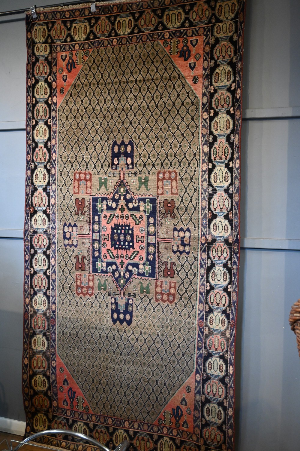 A BEAUTIFUL & COLOUR FULL PERSIAN KOLYAIE CARPET 100% WOOL PILE DYED WITH NATURAL DYES WITH A VIBRANT GEOMETRICAL UNUSUAL MEDALLION, WITH A CAMEL BEIGE TONE LINKED CHAIN ALL OVER DESIGN FIELD. ALSO WITH 4 HALF DIAMOND CORAL TONE MEDALLIONS, FINISHED WITH AN INDIGO BLUE OUTER BORDER. A DENSELY WELL HAND KNOTTED RUG. SIZE: 317 X 158 CM ORIGIN: PERSIA – RRP: $2,600 DOCUMENTATION OF AUTHENTICITY INCLUDED.