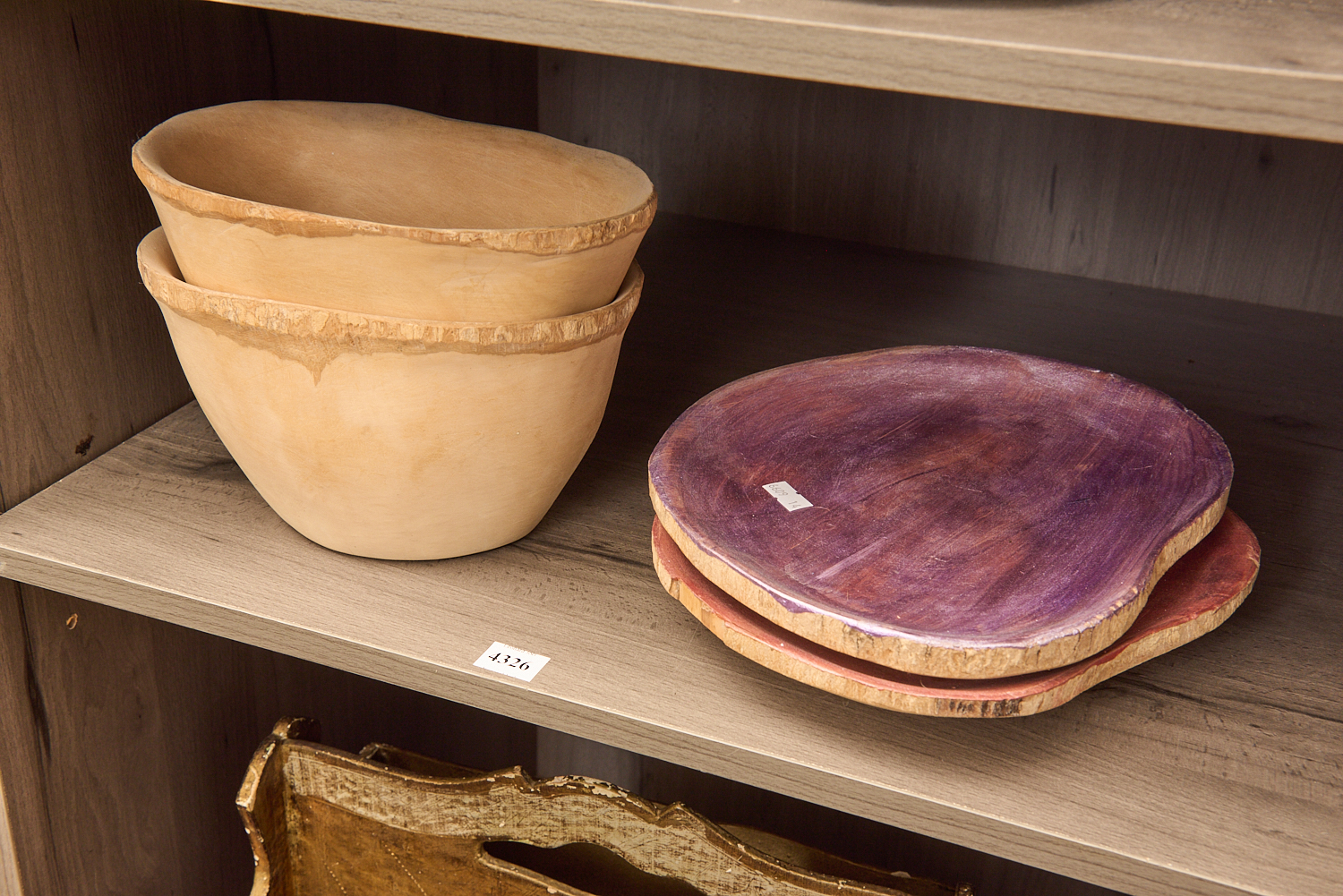 A COLLECTION OF WOODEN PLATES AND BOWLS DIA. 25CM, LEONARD JOEL LOCAL DELIVERY SIZE: SMALL